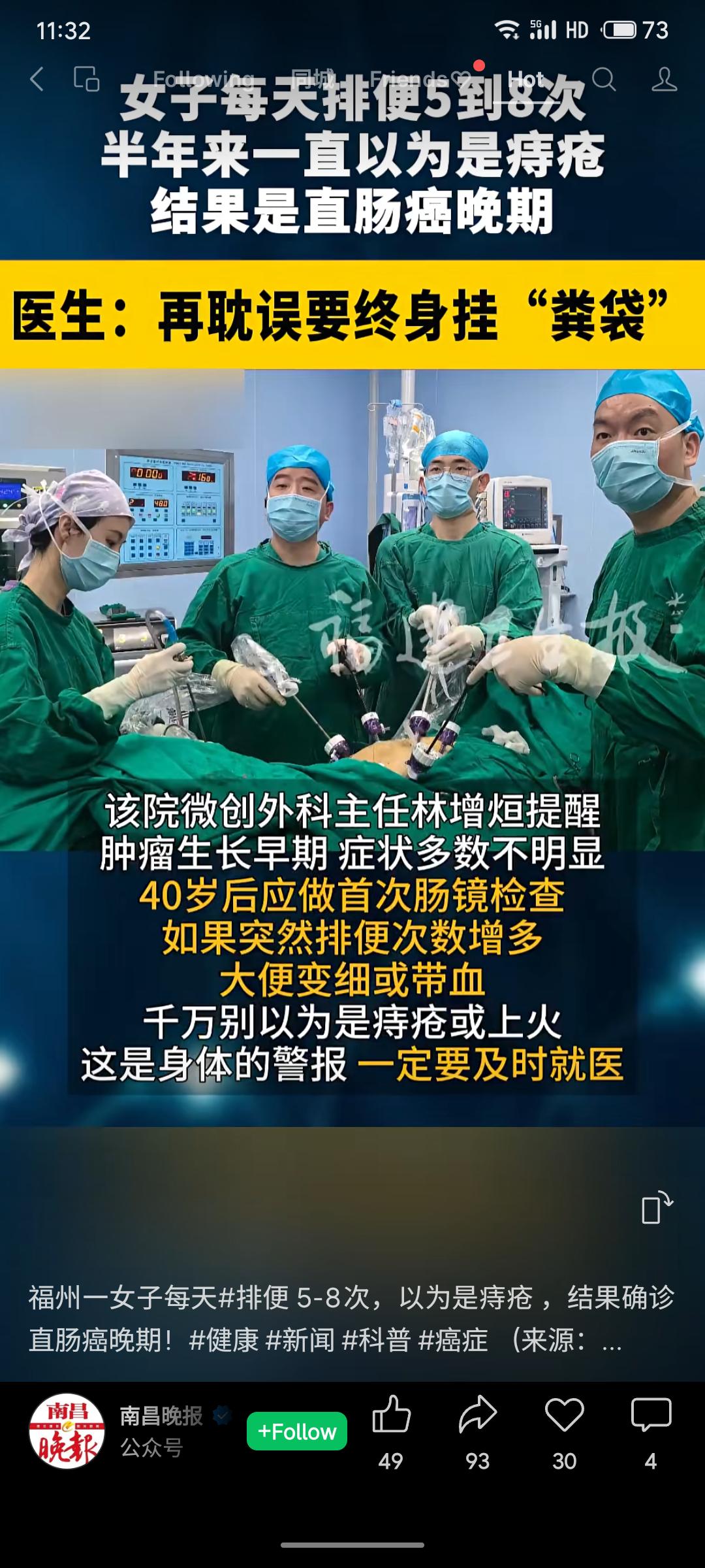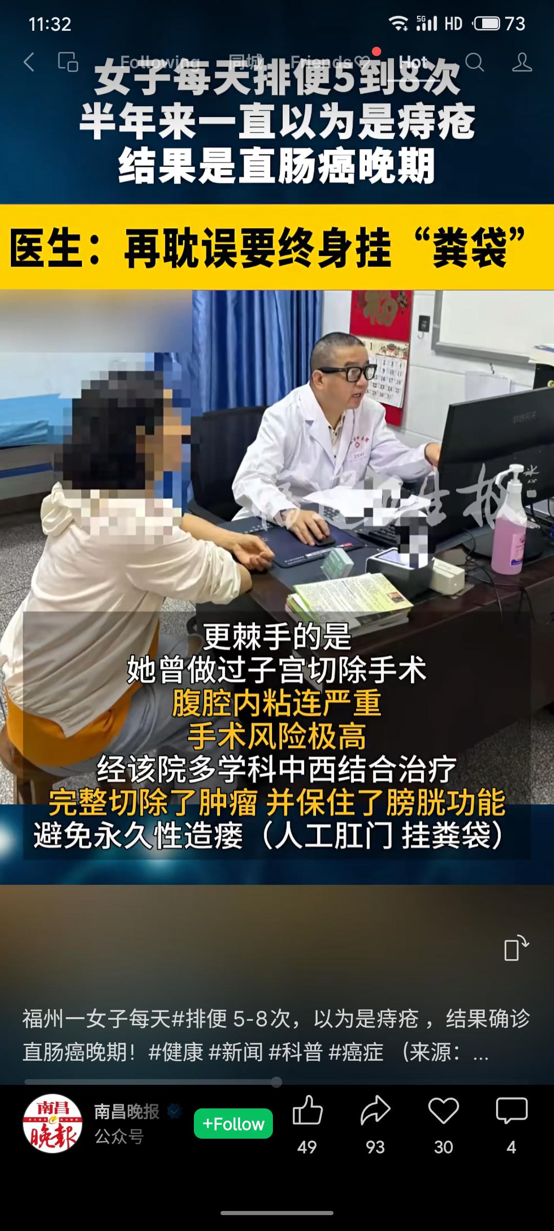 福州59岁李女士半年来每天排便5-8次,自以为是痔疮未重视,直至便血才就医,结果确诊直肠癌晚期,肿瘤已侵犯膀胱。医生紧急手术并成功保肛,同时强调便频、便细、带血是重要警报,40岁后应做肠镜筛查避免误诊。