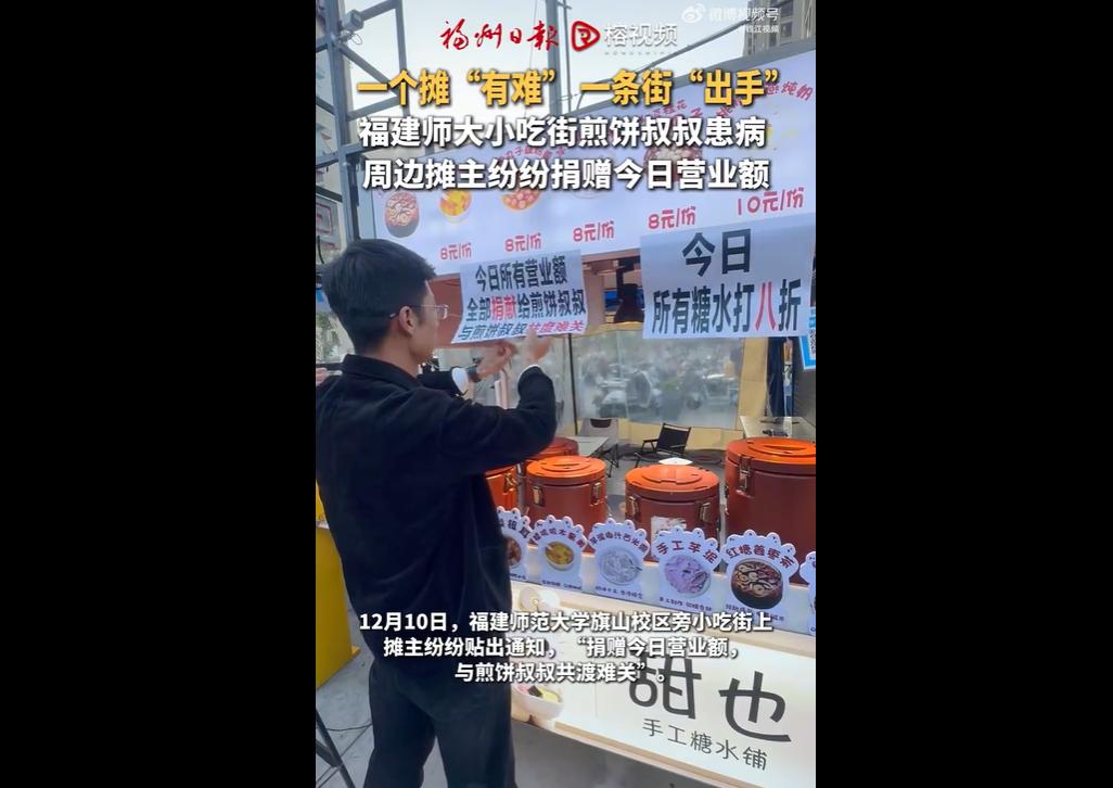 近日,福建师大旗山校区旁小吃街的煎饼摊主张叔叔确诊癌症,家人无奈网上求助。 学生李梦珍转发消息后,学子们纷纷响应。 令人动容的是,张叔叔的同行摊主们自发捐出当日营业额、更换收款码,大学生们则排队消费、主动加钱,整条街默契上演爱心接力。 先夸这群摊主格局炸裂! 都说 “同行是冤家”,可他们非但没趁火打劫,反而把自己赚的辛苦钱全捐出去,甚至换上张叔叔的收款码帮衬。 小本生意赚的都是汗水钱,一天营业额可能就是一家人的生活费,这份仗义比那些捐点钱就吆喝的明星富豪实在多了! 再说说这帮大学生,太会做事了! 不搞空泛的捐款,直接排队买小吃,既帮衬了生意,又给足了张叔叔尊严。 悄悄加钱的小动作,藏着最熨帖的善良,比在网上喊口号强一百倍! 最后也得吐槽现实的无奈:一个小摊贩生场大病就被逼到上网求助,要是能有更完善的大病救助机制,何必要靠街坊邻居凑钱渡难关? 希望这份温暖能倒逼相关帮扶政策落地,别让好人只能靠互相取暖!