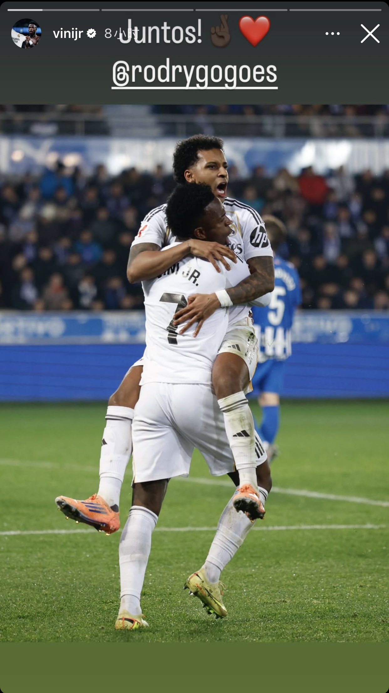 他的队友维尼修斯也更新了两人相拥庆祝的合影:同心协力!