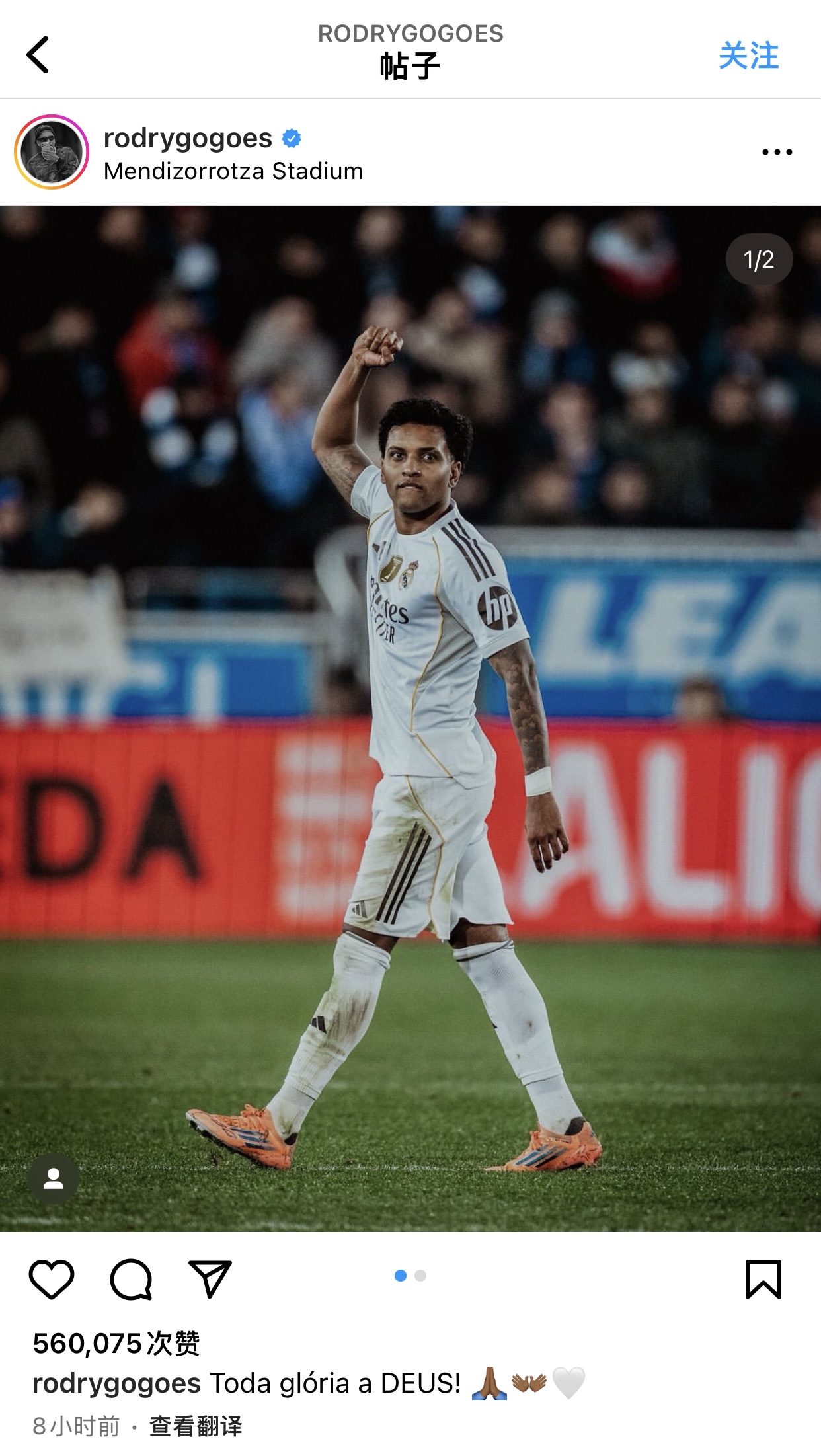 赛后,罗德里戈更新了Instagram:荣耀归于上帝!