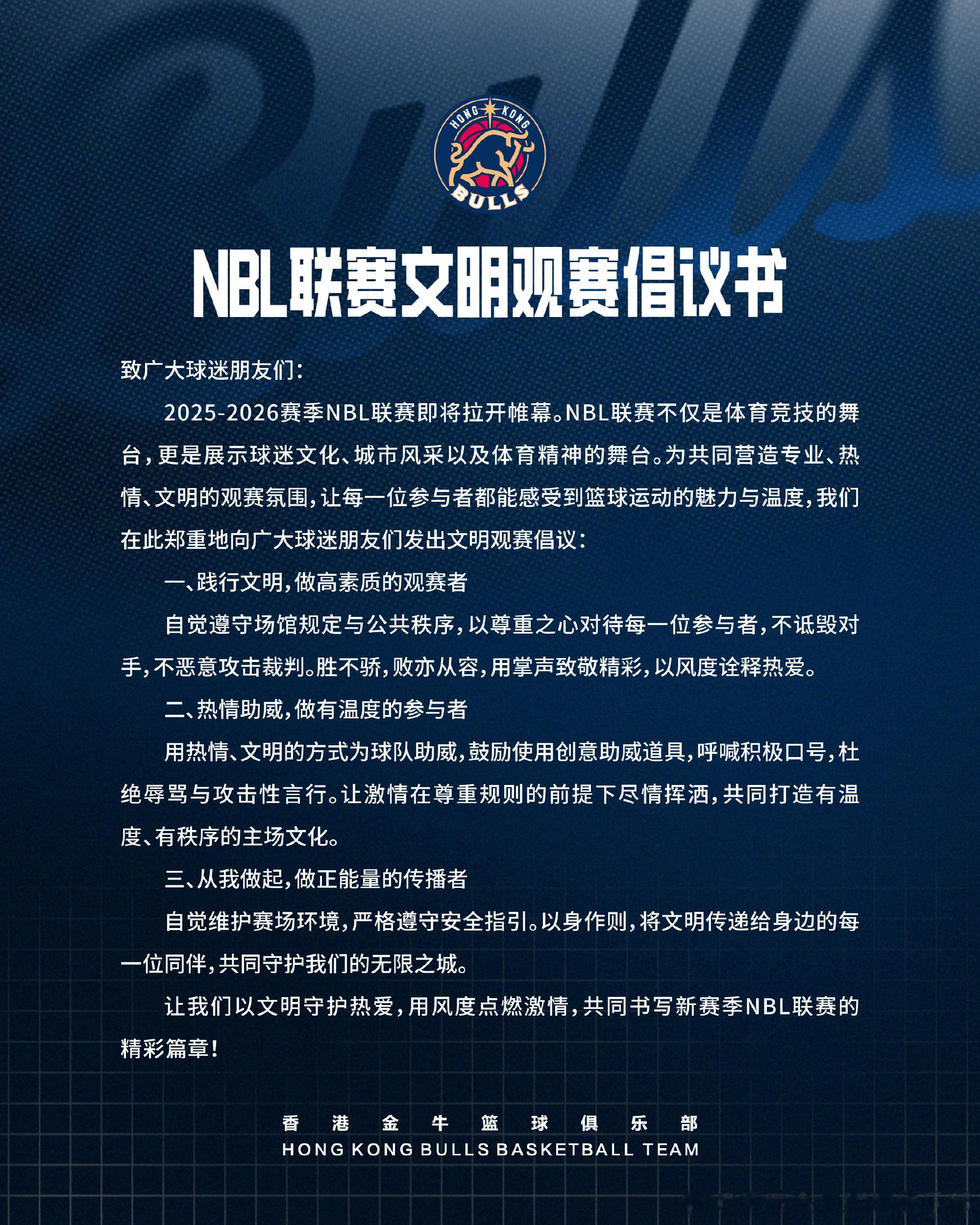 虎扑12月15日讯今日,香港金牛官方发布NBL联赛文明观赛倡议书。