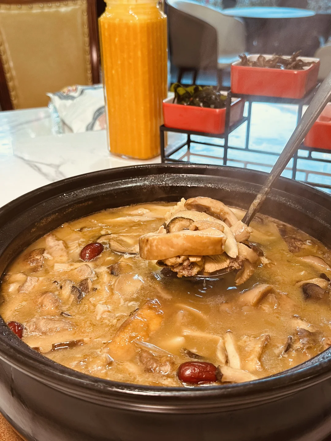 ✅ 土鸡锅底+野生菌拼盘:老母鸡慢炖的高汤金黄浓郁,倒进见手青、牛肝菌、松茸、竹荪等N种山珍,服务员会架计时器煮20分钟,还会先采样超安心~ 开盖瞬间鲜味儿直冲天灵盖,先喝3碗汤,鲜到掉眉毛!