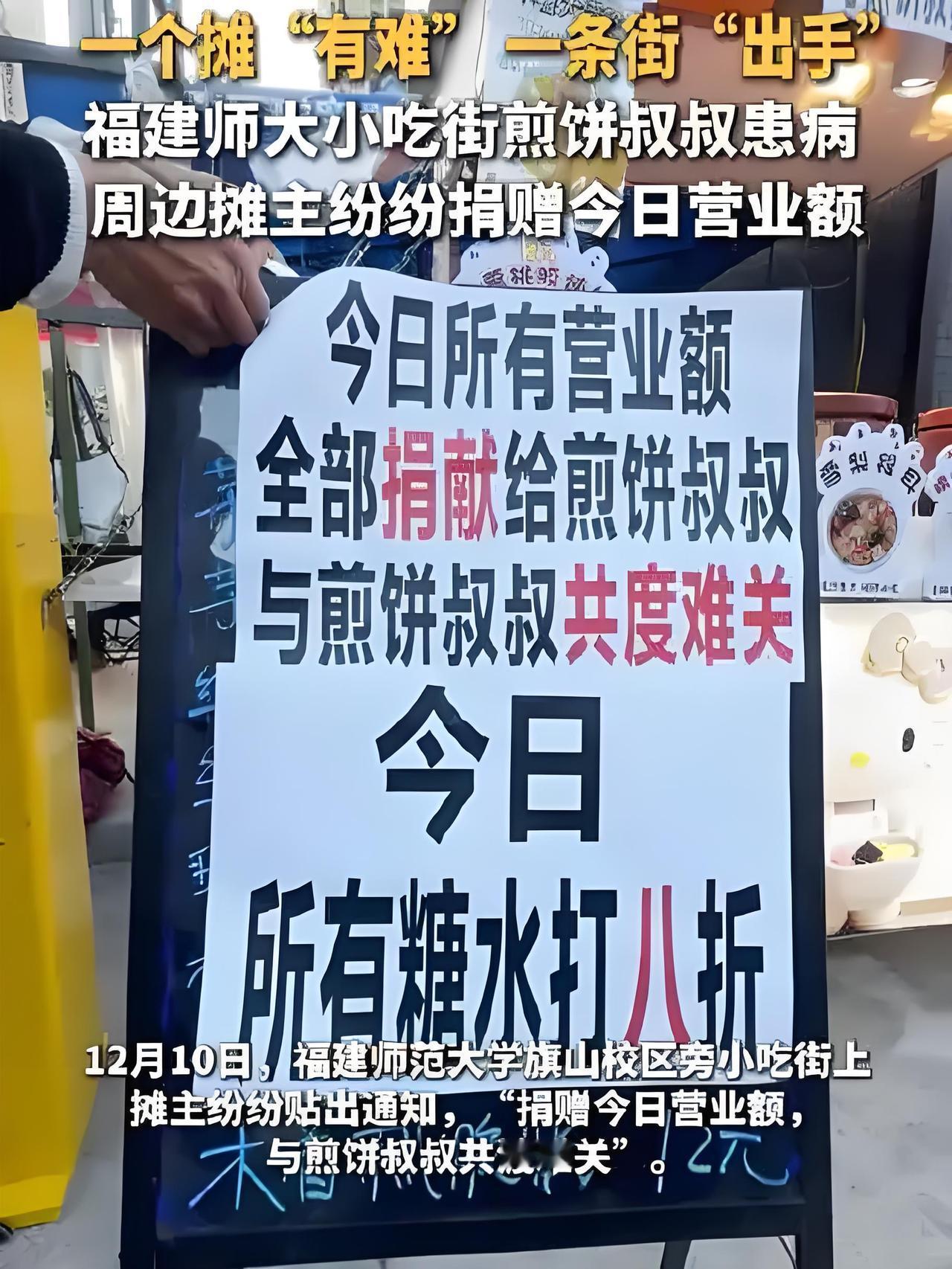 这样的正能量新闻,总能给人满满的温暖。 近日,福建师范大学旗山校区旁边的小吃街,好多个摊位都统一换上了患癌摊主“煎饼叔叔”的收款码,打算把当天的营业额全捐给他,帮他凑医药费。 这事是从学生转发求助信息开始的,周边的摊主看到后,没谁组织,全是自发加入进来,一起搭起了这场爱心接力。 大家过日子都不容易,可碰到别人有难处,还是会毫不犹豫地伸手帮忙,这才是咱们中国人骨子里的善良和力量。 人间有正能量 社会正能量 正道传播正能量 正能量说热榜