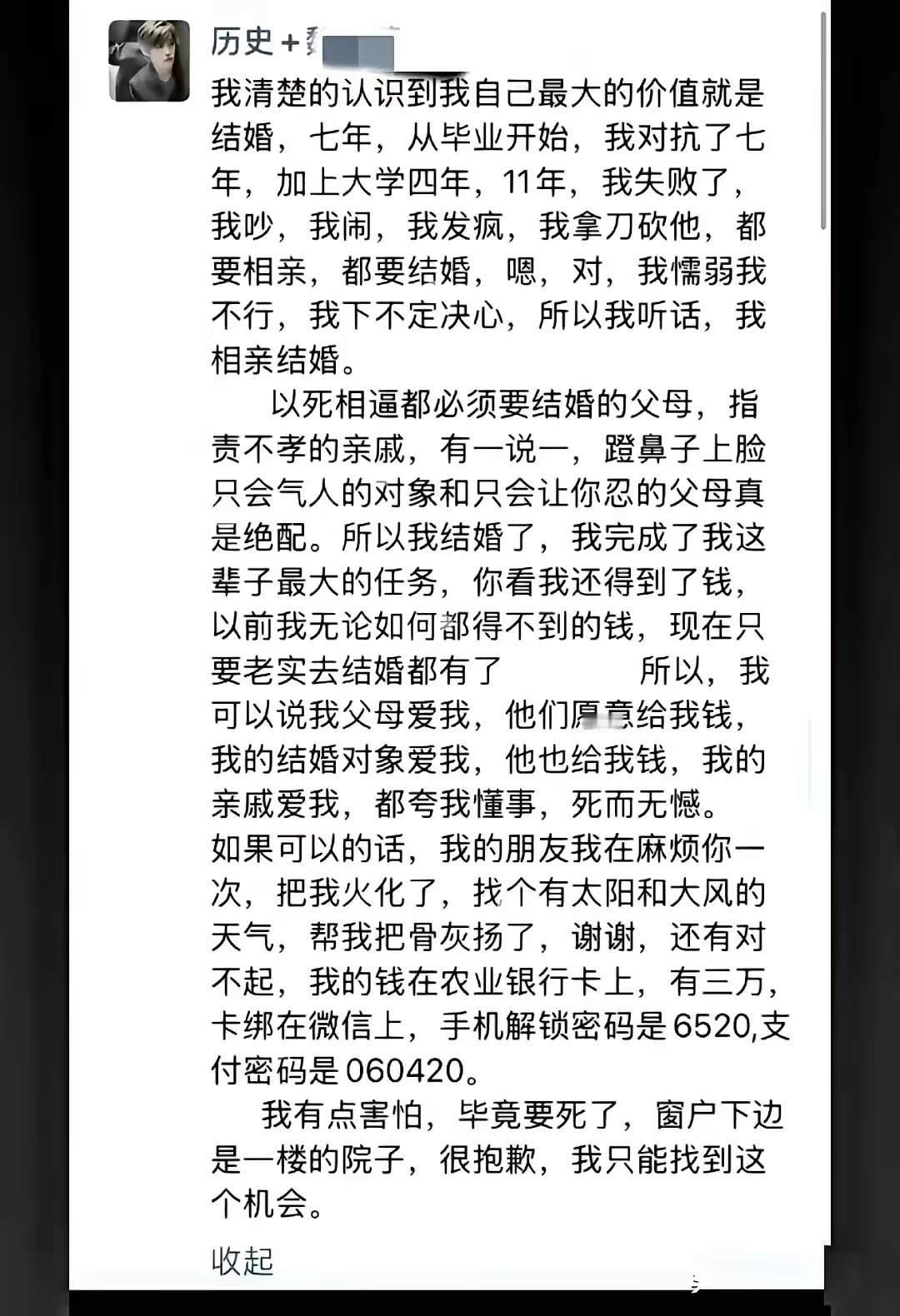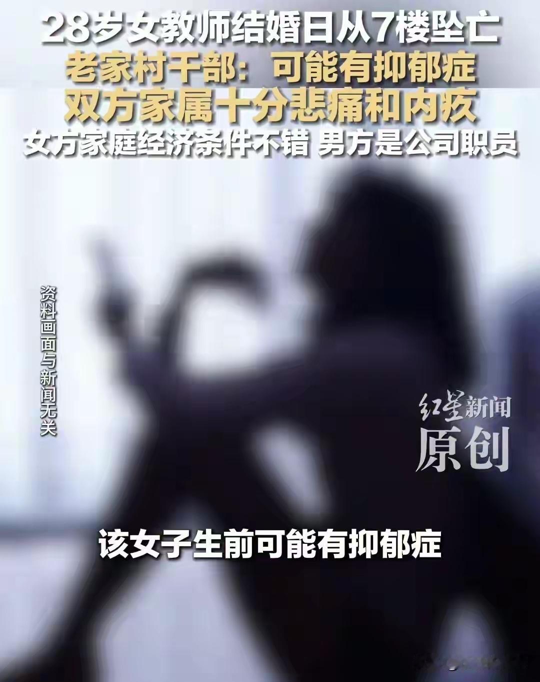 原来,鲁山新娘可能有抑郁症,双方家属十分悲痛和内疚,女主轻生是悲剧,但新郎有点无辜了 新娘是当地重点的高中历史教师。她以面试笔试总成绩第一考编入校任教担任历史教学,她本应该明艳热烈热情温暖的过完她的一生,可因为抑郁症在结婚当天选择轻生,她念了那么多年书,教了那么多年书,不甘于只做提线木偶活着。一眼到头的生活,和不自由的人生,确实让人窒息。花样的年纪,诗和远方都还在,只是人生匆匆,画上了句点,太可惜了。 其父母应该没意识到抑郁症会导致这么严重的后果,如果他们给女儿找医生看看,不那么逼婚,也许悲剧就不会发生了。如今父母白发人送黑发人肯定悲伤欲绝,如果能够重来,他们一定不会催婚的,不管女儿结婚不结婚是她的自由。结婚过一辈子,不结婚也是过一辈子。 新郎是一家公司职员,一表人材,工作好,到了适婚年龄,经人介绍认识了才貌双全的女主,女主漂亮,重点高中教师,工作好,他本来以为找到了两情相悦的意中人,两人在双方父母祝福下订亲,过彩礼。两人一起拍婚纱照,选婚戒,订酒店……良辰吉时,他准备盛大的婚礼迎娶心爱的人过门,谁料想女主有抑郁症,又因被催婚而在结婚当天选择轻生。新婚丈夫的痛,是这场悲剧里最沉默的伤口。他没有做错什么,却要用一生去治愈这一天。 最可怜的是新郎一家,新郎一家本来高高兴兴办喜事,憧憬着美好的生活。没想到新娘子没了,新郎还没入洞房就变成二婚,新郎不管是经济上还是精神上多多少少都会受到伤害,以后估计找对象结婚都有心理阴影了。鲁山坠楼新娘 婚礼跳楼 跳楼新娘