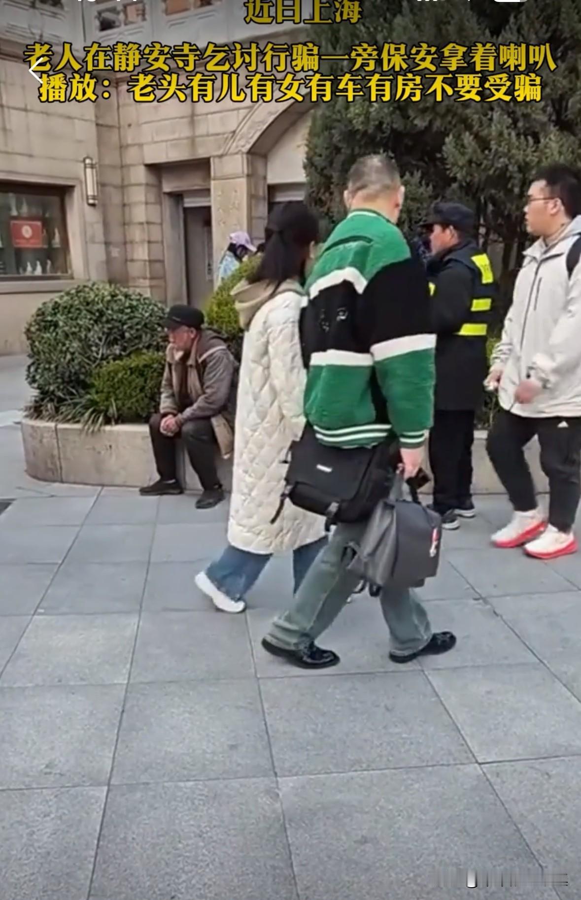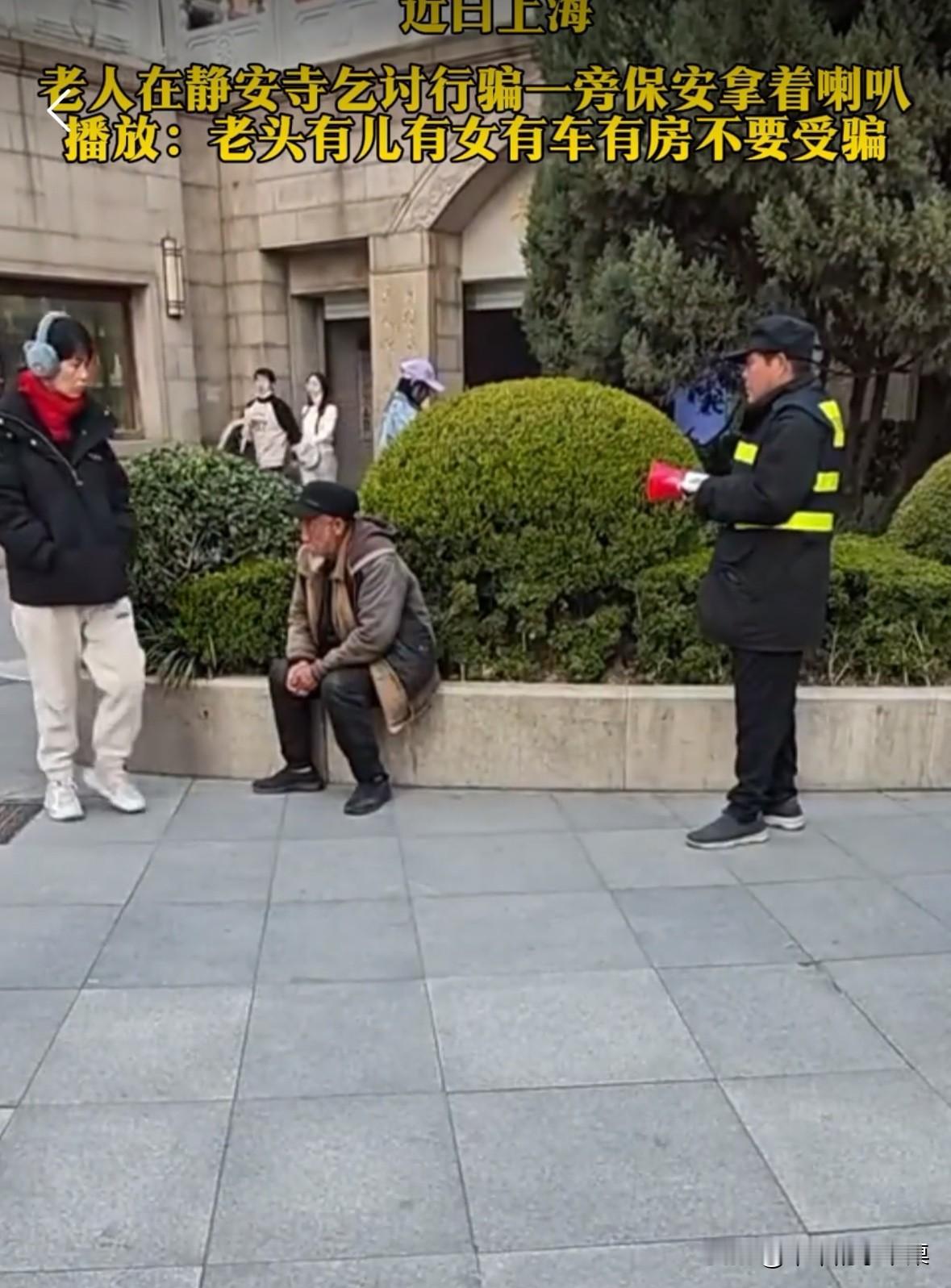老人在寺庙里乞讨行骗,寺庙里的保安看不下去了。 于是拿着喇叭循环播放:“老人有儿有女有车有房,请大家不要上当受骗,他是骗子!” 这种老人最可恨,利用大家的同情心,就想不劳而获。 有儿有女有房有车不在家安心养老,还出来行骗,是不是尝到的好处太多了。 其实现在乞讨,已经成为了一种职业,有的乞讨者一个月要的钱比工资阶层的人一个月挣的钱还多,而且个个有车有房有存款。 他们的日子比我们好过多了。 保安做的对,支持。流浪乞讨人