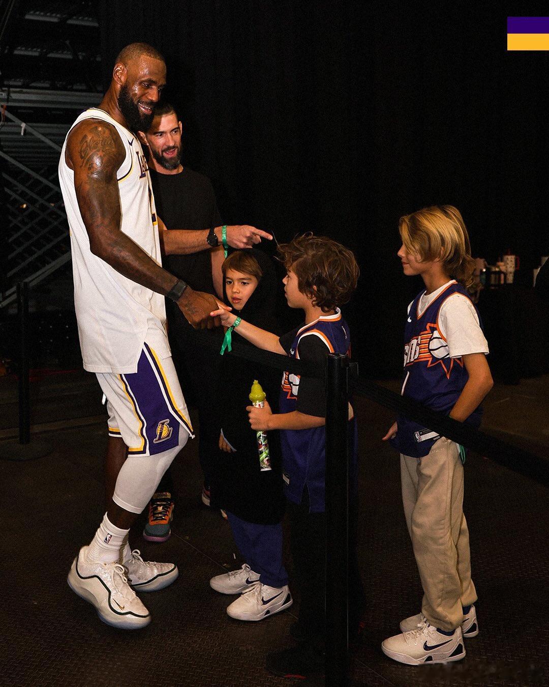 菲尔普斯和詹姆斯自拍 湖人客胜太阳赛后,詹姆斯与菲尔普斯以及菲尔普斯的儿子们打招呼,并且进行自拍。菲尔普斯有四个孩子,都是儿子,不过小儿子还不到两岁,可能没来吧。