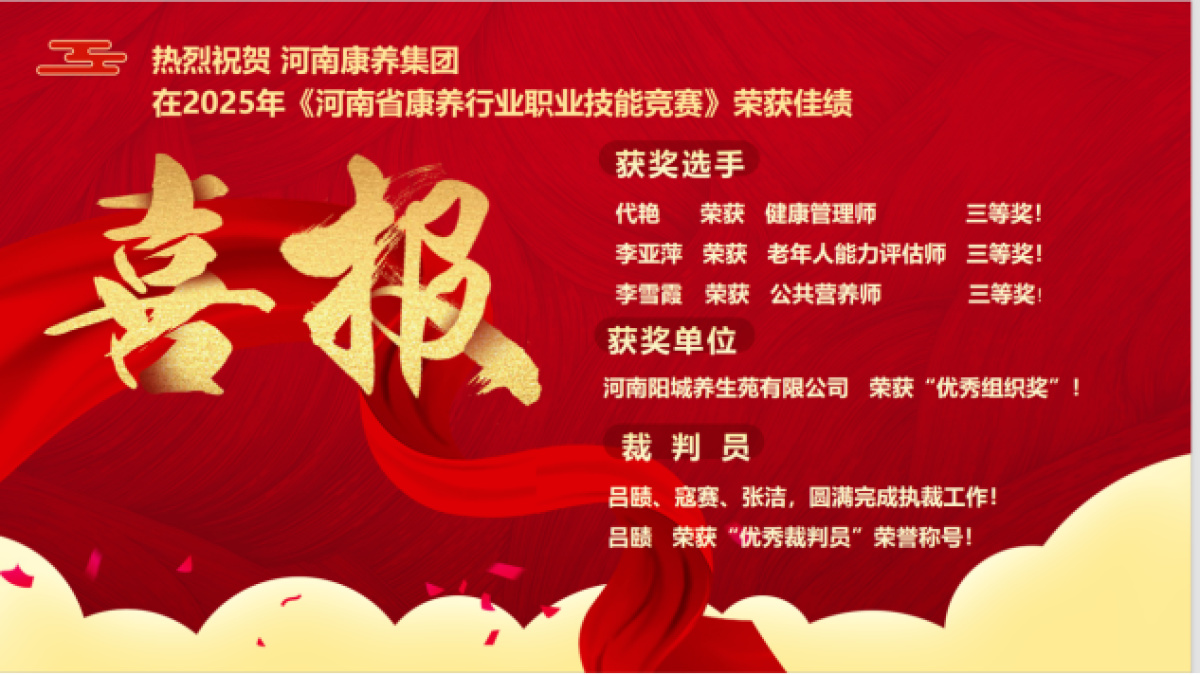 展望未来,河南康养集团将继续搭建多元化的专业技能提升平台,鼓励更多员工深耕专业、锤炼本领,并将赛事中积累的宝贵经验转化为系统化的培训资源,持续赋能员工成长。我们致力于将更专业、更优质、更温暖的服务融入日常,以扎实的专业能力守护每一位长者的幸福晚年。