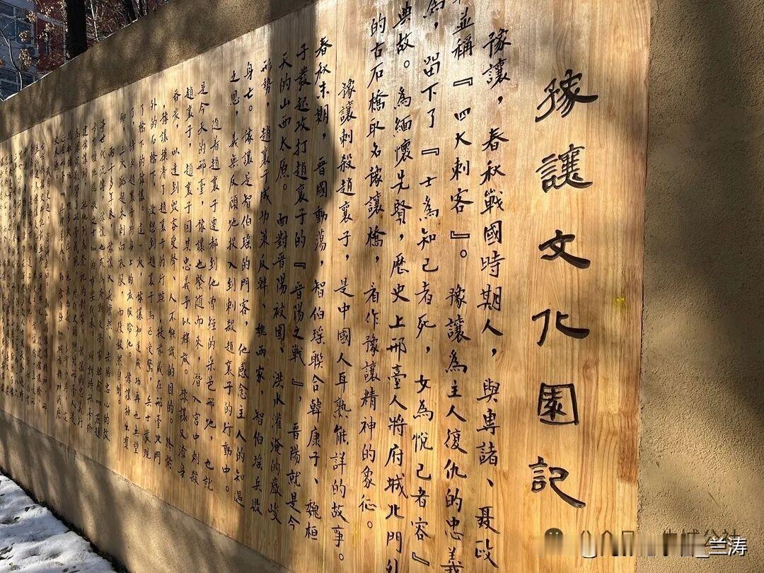 游豫让文化园,品燕赵忠义风骨 邢台新建一座豫让文化园,踏入邢台新晋文化地标豫让文化园,仿建的石板桥古朴厚重,似在静静诉说往昔故事。行至坚毅雕塑前,豫让那决绝的神情、挺拔的身姿,尽显为知己赴死的果敢。再看那刻满“士为知己者死”典故的文化墙,字字铿锵,句句泣血。漫步其间,我仿佛穿越千年,与忠义之士对话。燕赵大地,自古多慷慨悲歌之士,豫让以生命诠释的忠义风骨,如璀璨星辰,照亮历史长河,也深深烙印在吾辈心中。