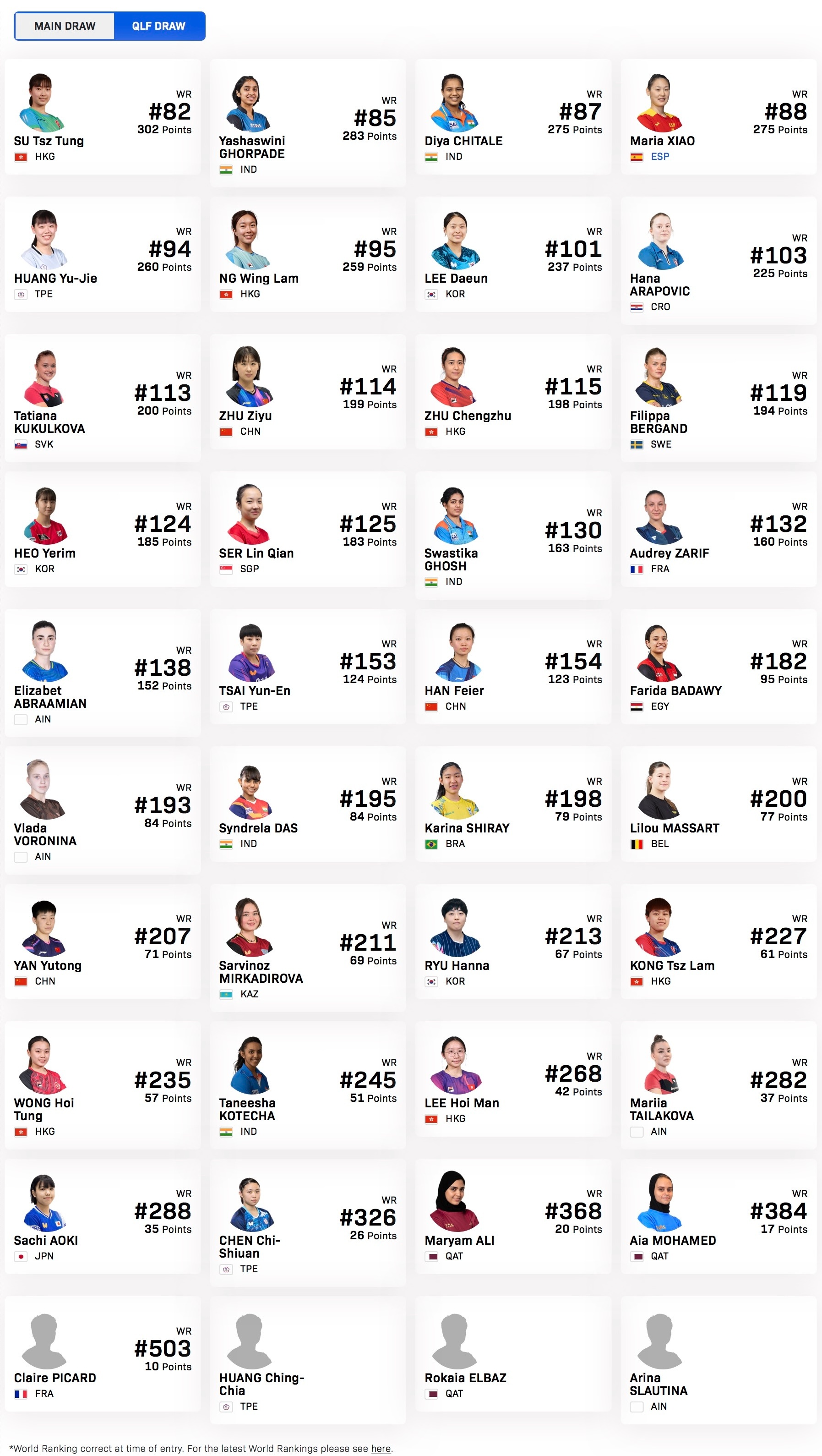 WTT球星挑战赛多哈站2026【女单参赛名单】比赛时间:2026.1.13-1.18正赛:蒯曼🇨🇳,朱雨玲🇲🇴,陈熠🇨🇳,申裕斌🇰🇷, 石洵瑶🇨🇳,大藤沙月🇯🇵,木原美悠🇯🇵,朱芊曦🇰🇷,郑怡静(中国台北)袁嘉楠🇫🇷,帕瓦德🇫🇷,金娜英🇰🇷,佐藤瞳🇯🇵,何卓佳🇨🇳,李恩惠🇰🇷,波尔卡诺娃🇦🇹,覃予萱🇨🇳,横井咲樱🇯🇵,曾尖🇸🇬,杜凯琹🇭🇰, 梅谢芙🇪🇬,叶伊恬(中国台北)赫西🏴󠁧󠁢󠁷󠁬󠁳󠁿,芝田沙季🇯🇵, 考夫曼🇩🇪,巴特拉🇮🇳,王晓彤🇨🇳,纵歌曼🇨🇳,平野美宇🇯🇵,巴乔🇵🇱,金成珍🇰🇷,梁夏银🇰🇷, 阿尔霍达比🇪🇬,资格赛: 苏籽童🇭🇰,戈尔帕德🇮🇳,奇塔莱🇮🇳,肖瑶茜🇪🇸, 黄愉倢(中国台北)吴咏琳🇭🇰,李多恩🇰🇷,阿拉波维奇🇭🇷,库库尔科娃🇸🇰,朱梓予🇨🇳,朱成竹🇭🇰,博嘉德🇸🇪,许玴玪🇰🇷,舒麟茜🇸🇬,戈什🇮🇳,扎里夫🇫🇷,阿布拉米安AIN,蔡昀恩(中国台北)韩菲儿🇨🇳,巴达瓦🇪🇬,维罗妮娜AIN,达斯🇮🇳,濑长🇧🇷,马萨特🇧🇪,闫禹橦🇨🇳,米尔卡迪洛娃🇰🇿,柳汉娜🇰🇷,江芷林🇭🇰,黄凯彤🇭🇰,科特查🇮🇳,李凯敏🇭🇰,泰拉科娃AIN,青木咲智🇯🇵,陈琦媗(中国台北)