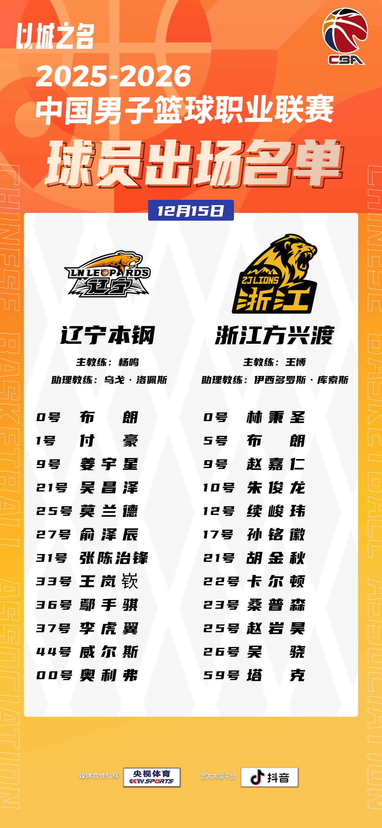 虎扑12月15日讯今日CBA常规赛辽宁vs广厦,赛前双方大名单已经出炉。