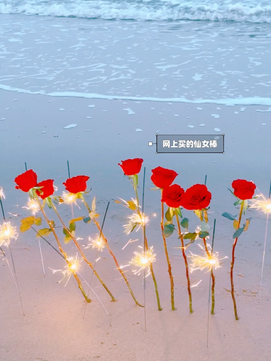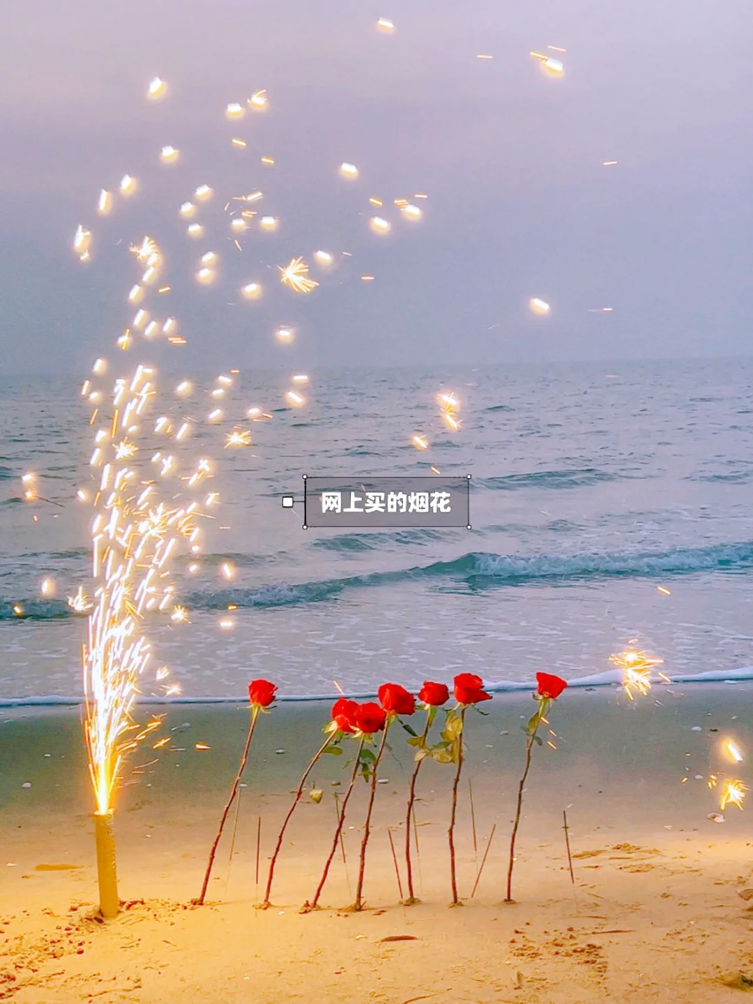 ✔️我提前准备了玫瑰花&烟花🧨&仙女棒🪄,拍照氛围感十足,忘记带也没关系,花在海边市集也有卖