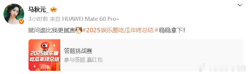 马秋元今年到底吃了多少瓜 这个漂亮宝贝今年是住在瓜田里了吗?参加完2025娱乐圈吃瓜年终总结 后自信放话到:“就问谁比我更厉害稳稳拿下!”这是吃了多少瓜才敢这么说啊!2025娱乐圈吃瓜年终总结