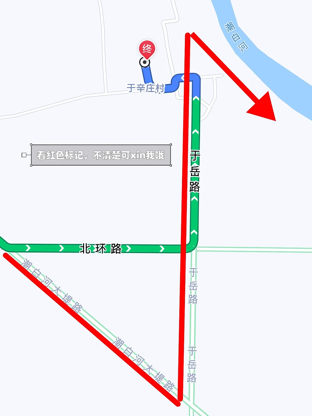 按照⬆️地址导航,走于岳路,到目的地后沿着河堤走,过了盖房子的位置100米左右有下去的土路(可参照图9⃣️标记路线)