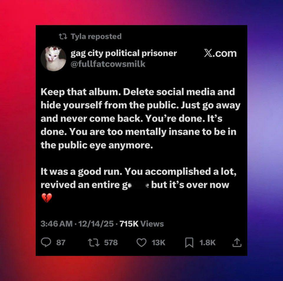 泰辣手撕麻辣鸡?!Tyla今天转发一条要求麻辣鸡Nicki Minaj退出娱乐圈的推文引发巨大争议,推文写道“留着那张专辑吧。删除社交媒体账号,从公众视野中消失。永远消失,别再回来。你完了。一切都结束了。你精神状态太不稳定,不配再出现在公众面前。这段历程很精彩。你成就斐然,重振了整个流派,但现在一切都结束了。”然而刚才,Tyla在ins发新照,配上了麻辣鸡的歌“Your Love”做BGM,还表示“又在网上遇到麻烦了😪”,暗示自己账号被黑。麻辣鸡最近因为频频支持特朗普并关注特朗普账号而遭遇群嘲和吐槽。