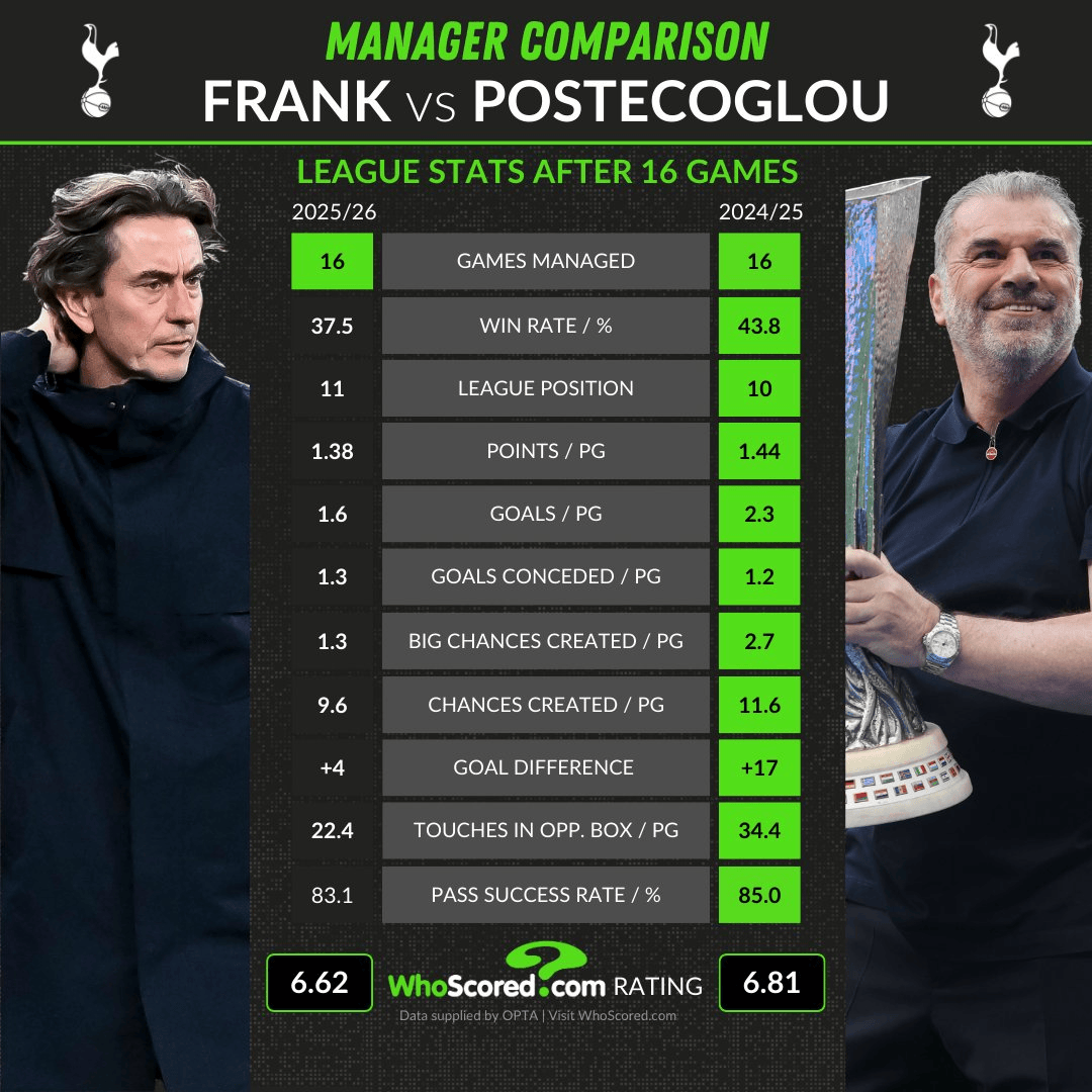 数据网站whoscored发布统计,盘点上赛季澳波治下的热刺和本赛季弗兰克治下的热刺在16轮后的表现。