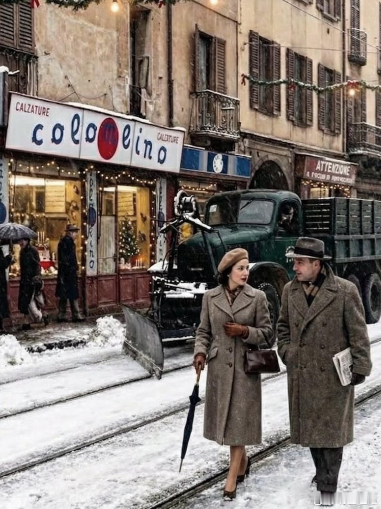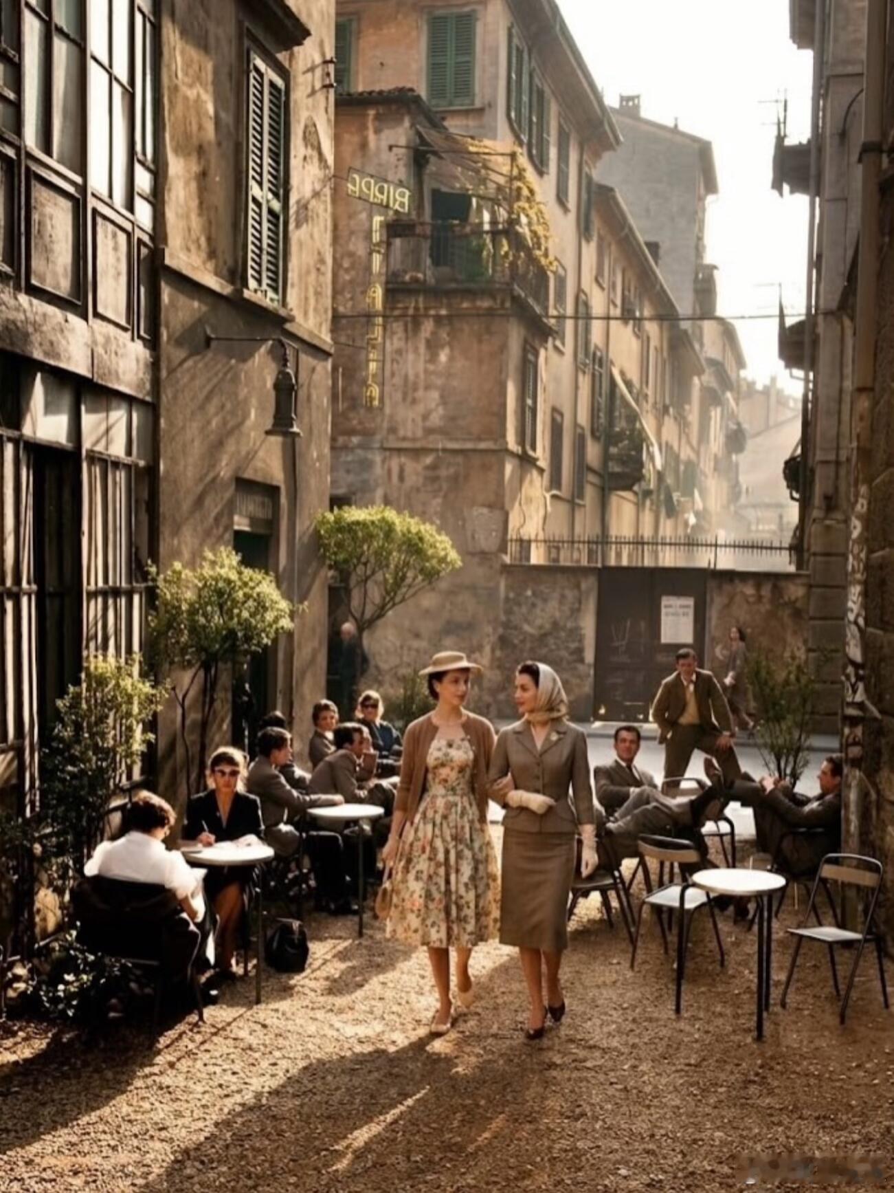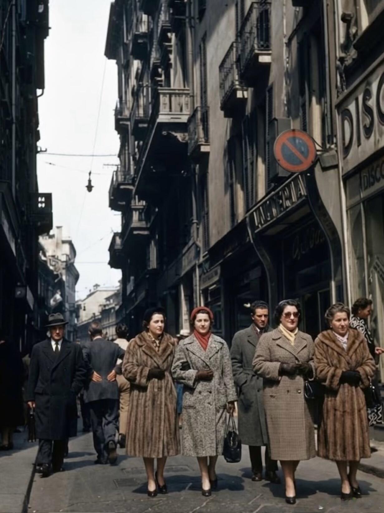 50年代的米兰有多优雅?1950年代的米兰拥有一种独特而难以复制的时代优雅,它既来自文化场景的仪式感,也来自日常生活中不言自明的讲究。街巷间并肩而行的女性们,以皮草、呢大衣、手套与小皮鞋构成了那个年代典型的米兰风情:低调、耐看、注重材质与态度。整个城市的建筑、街道与商铺也共同提供了一种天然的优雅背景,让服装与举止显得更为从容。