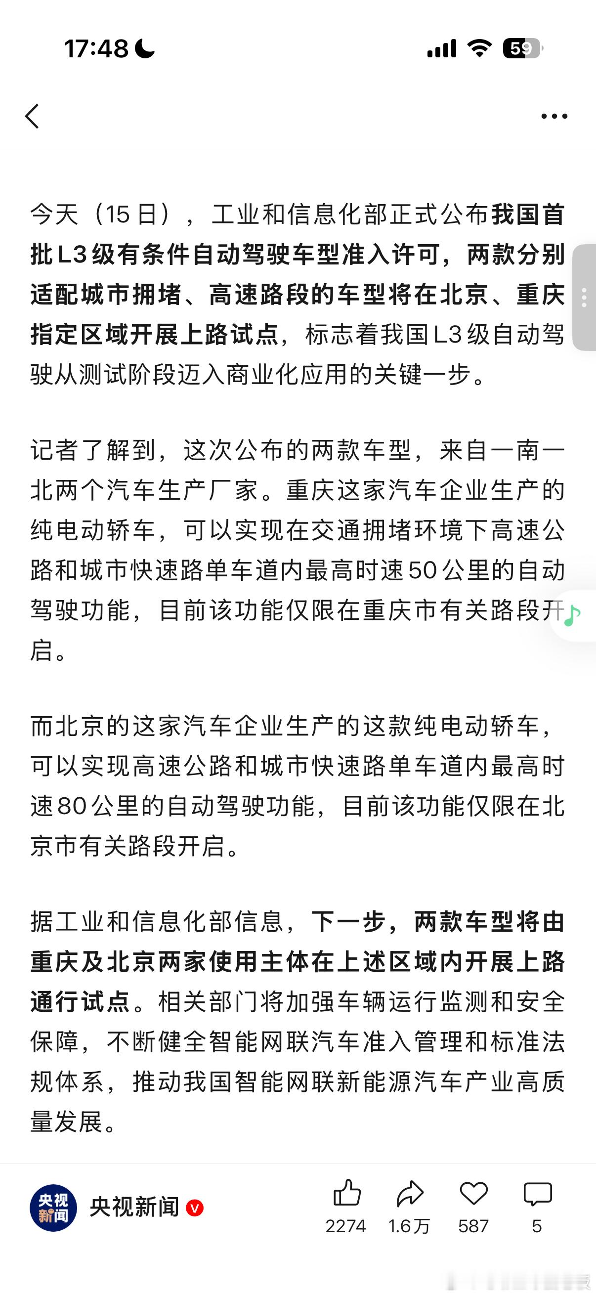 看到央视新闻的这条新闻,标题是:我国首批L3级自动驾驶车型,获得准入许可!看完全文有两个疑惑。1、没说是谁,只说是一南一北。好奇到底是谁。2、看细节,限定在五十公里时速或者最高80公里以下。拥堵下的高速公路和城市快速路、50公里或者80公里…..还是ODD的逻辑,跟全球泛化的逻辑很不一样。想了下,还是要去拉斯维加斯或者洛杉矶试下FSD V14。政策面滞后是合理的,但技术的发展还是要实事求是,去看去试。蟹老板的小报告