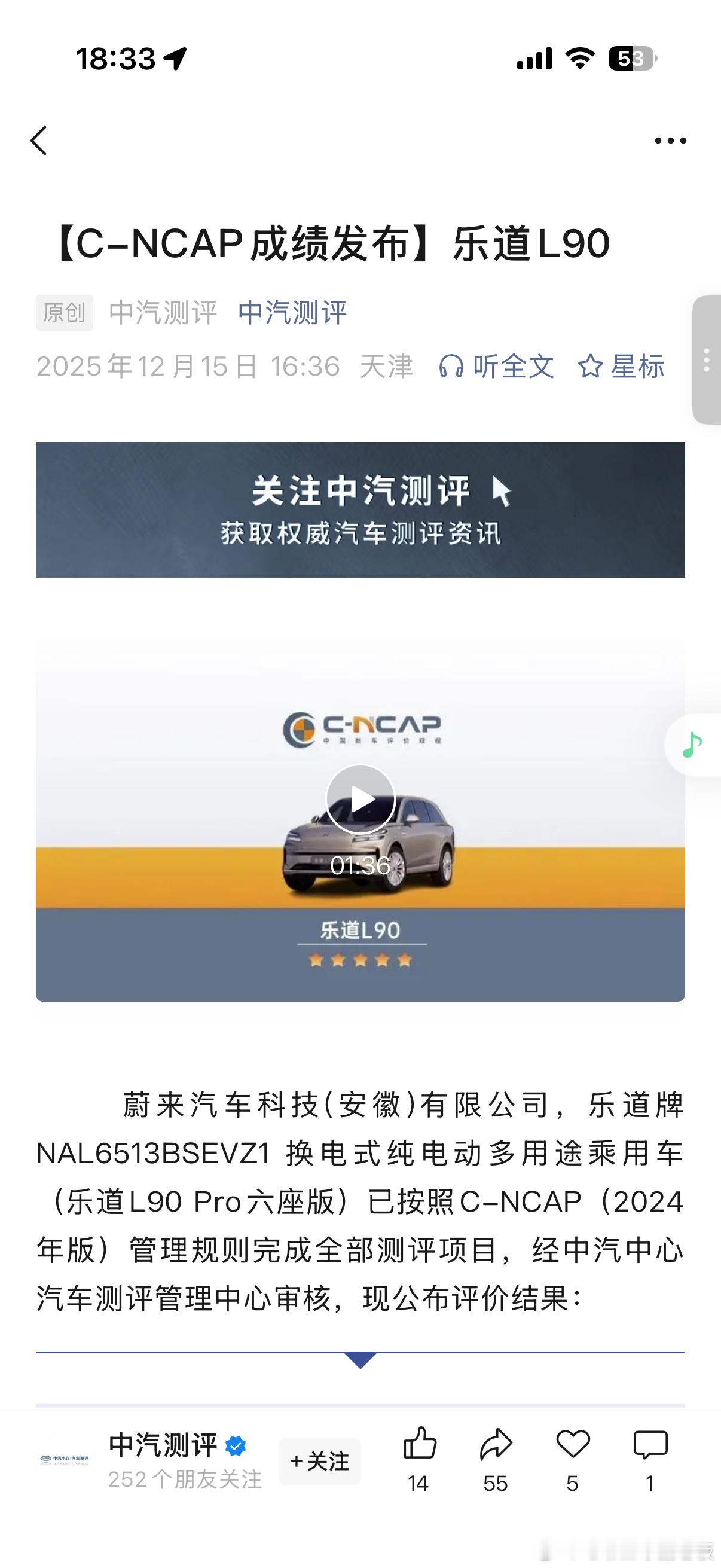 乐道L90的碰撞测试结果出来了,看了眼,还不错。五星,综合得分91.0%。看了眼中汽中心官方测评官网,在目前披露的2025测试年度的综合得分中排名第三。蟹老板的小报告