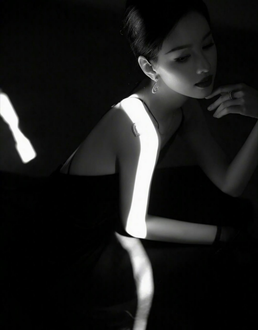 《灰色调里的光》深灰西装包裹着曲线像城市建筑的线条冷峻而精准浅蓝丝巾在颈