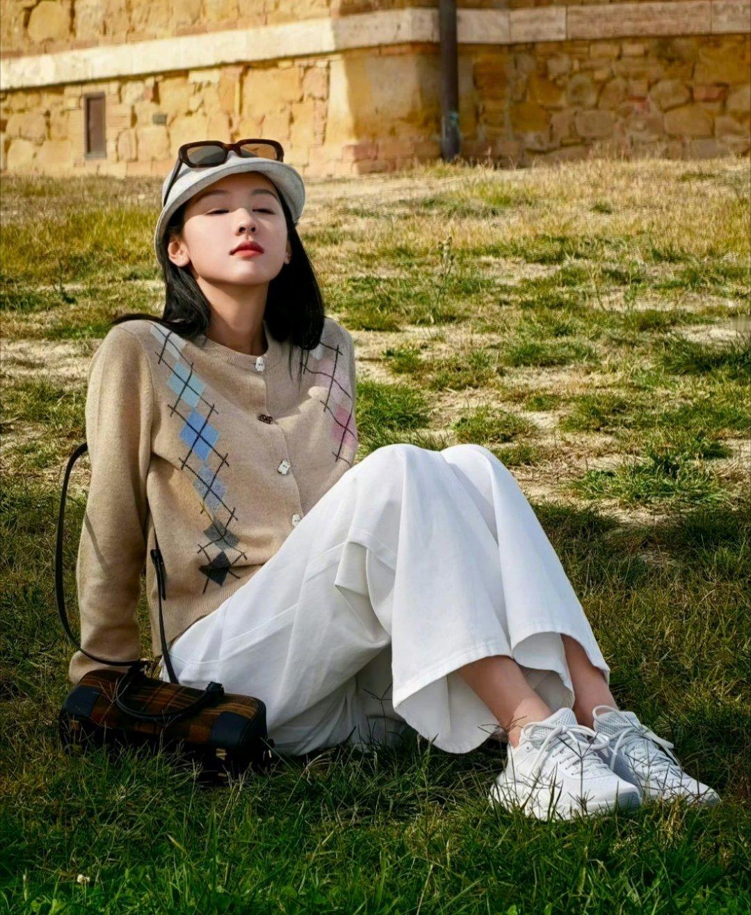 46岁的高圆圆和朋友现身成都,身穿红色毛衣配白色阔腿裤,脚踩休闲鞋,身材高瘦,走
