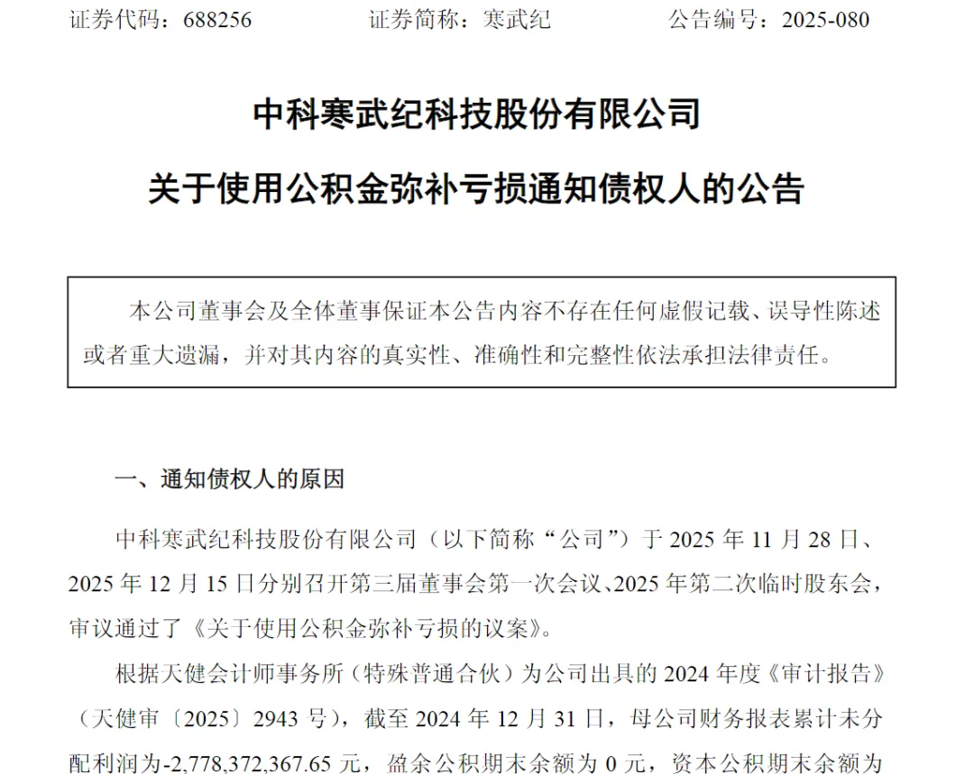 此前,寒武纪于11月29日发布公告称,公司第三届董事会第一次会议审议通过了《关于使用公积金弥补亏损的议案》,拟使用母公司资本公积约27.78亿元,用于弥补母公司累计亏损。