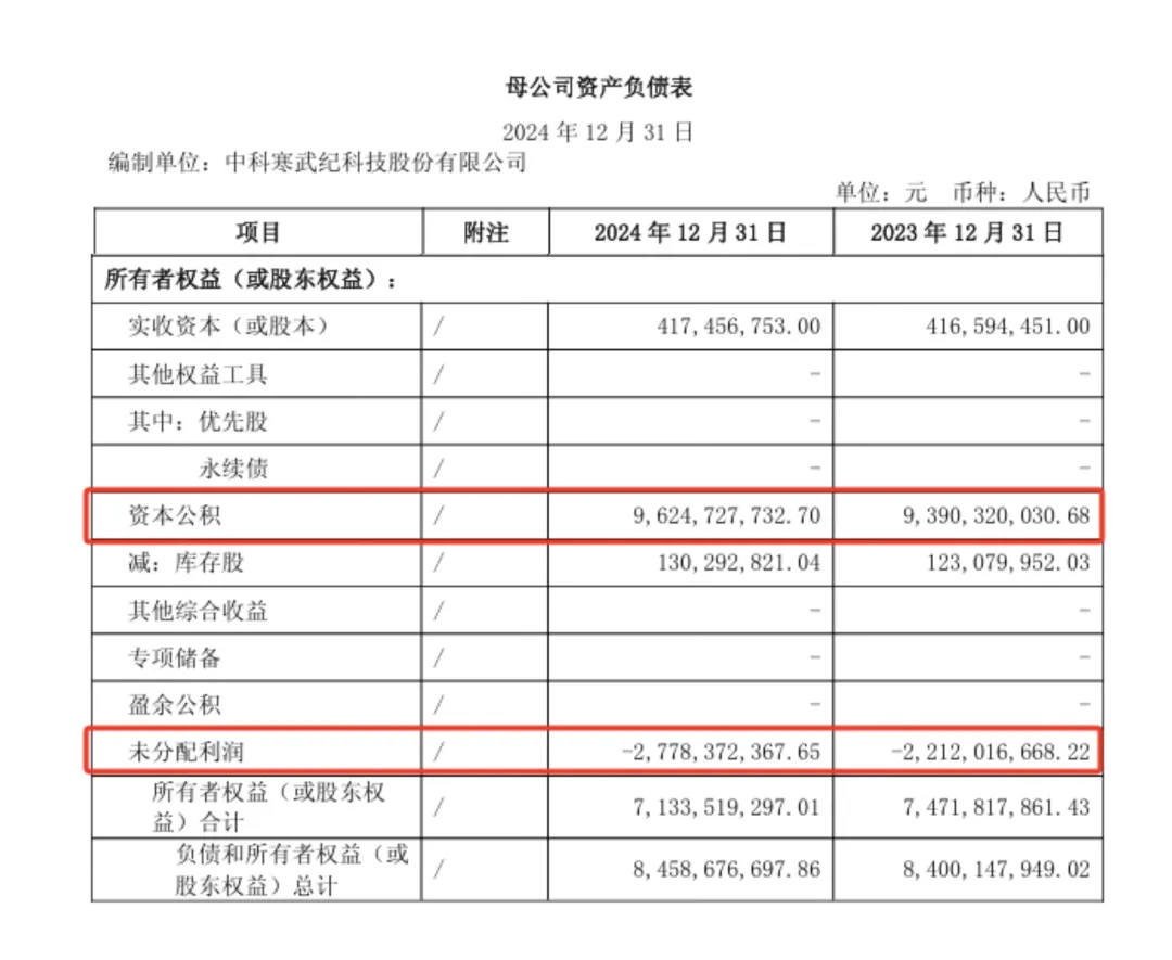 据披露,截至2024年12月31日,寒武纪母公司财务报表中累计未分配利润为-27.78亿元,盈余公积余额为0元,资本公积期末余额为96.25亿元。公司母公司未分配利润为负的原因主要为以前年度累计的亏损。拟用于弥补亏损的资本公积全部来源于股东以货币方式出资形成的资本(股本)溢价。