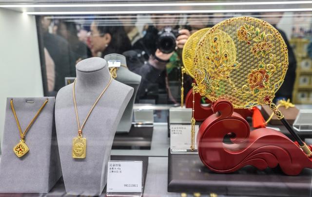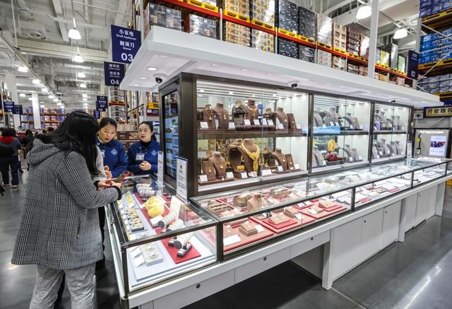 图为山姆浦东东店的珠宝柜台内种类丰富、做工精美的黄金首饰,供顾客选购。