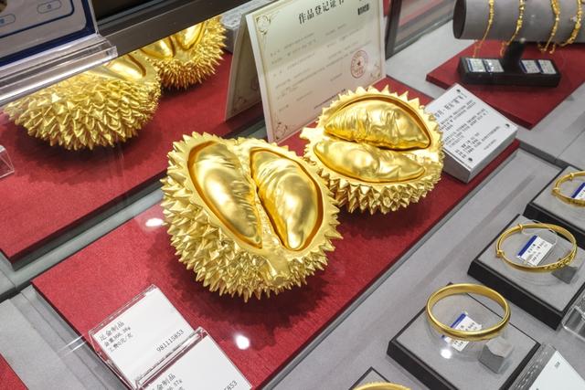 图为寓意“六六大顺,好运连连”的金枕榴莲造型足金摆件。