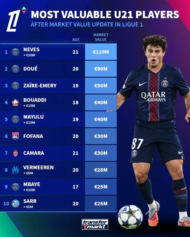 虎扑12月15日讯德转今日更新法甲最新身价,并盘点法甲联赛U21球员身价榜。