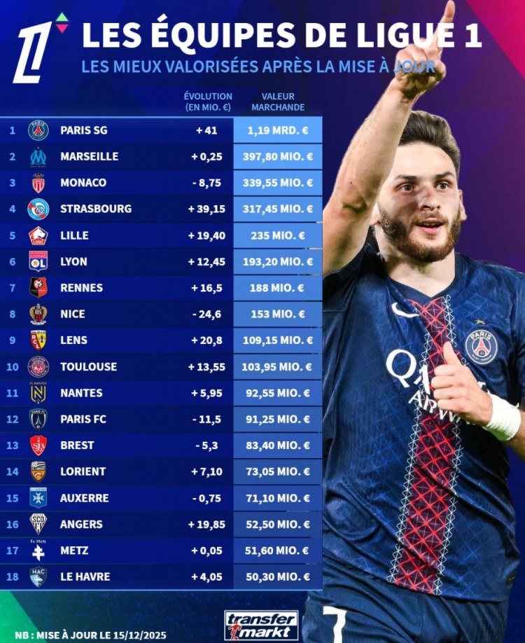 直播吧12月15日讯德转更新了法甲球员身价情况,也列出了法甲各队身价榜,巴黎全队身价比第二到第四名之和还多。