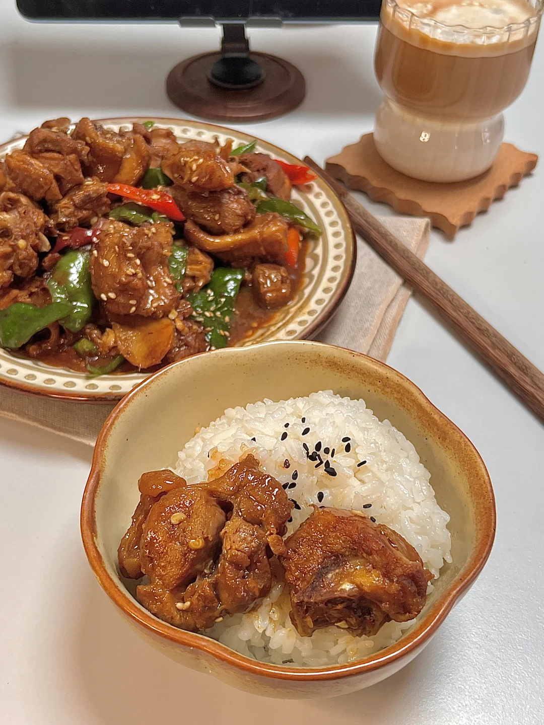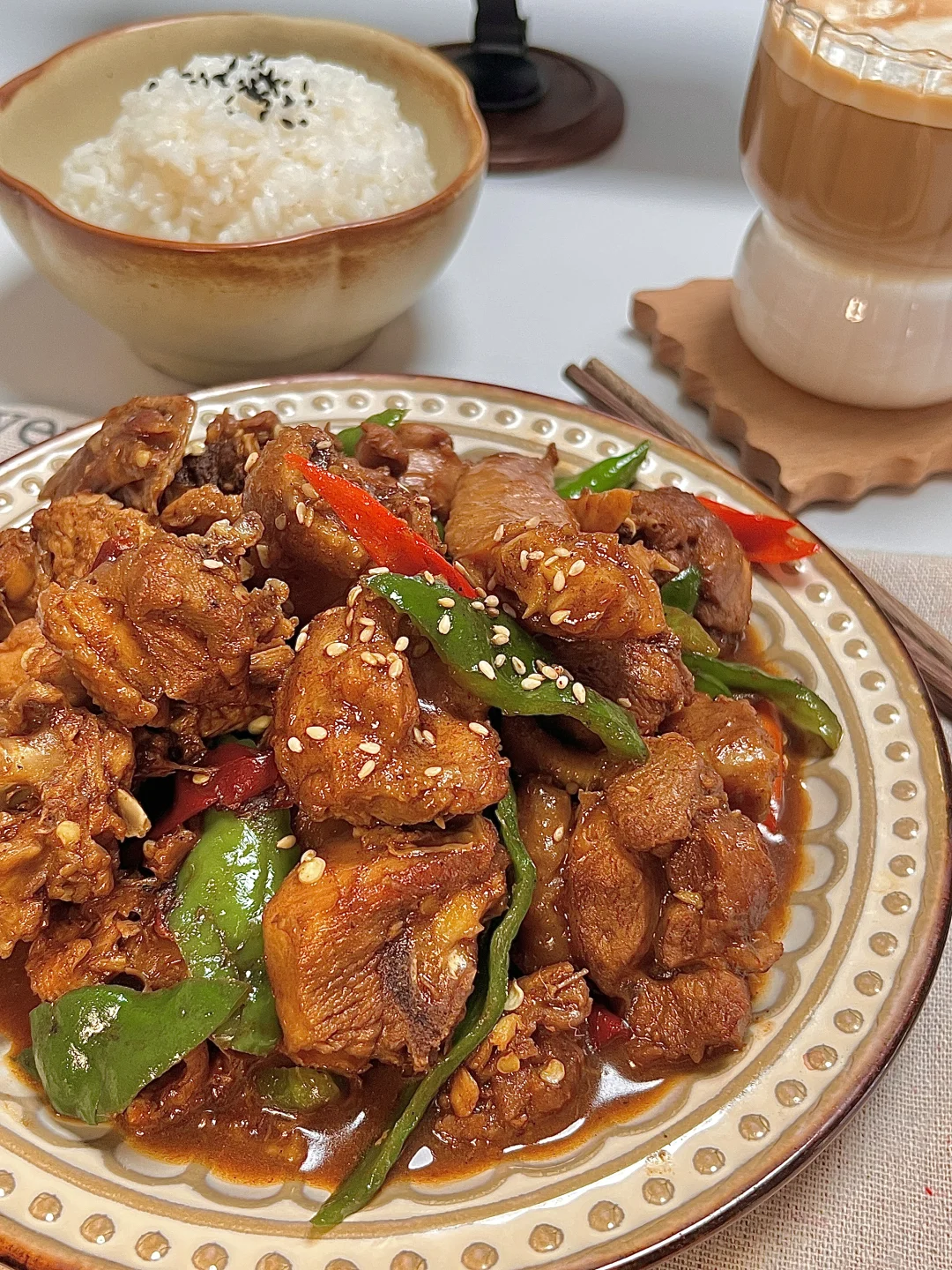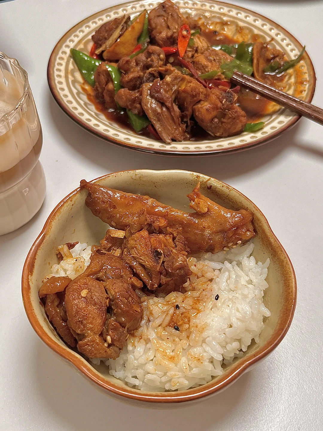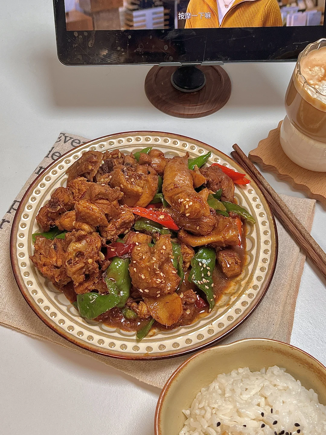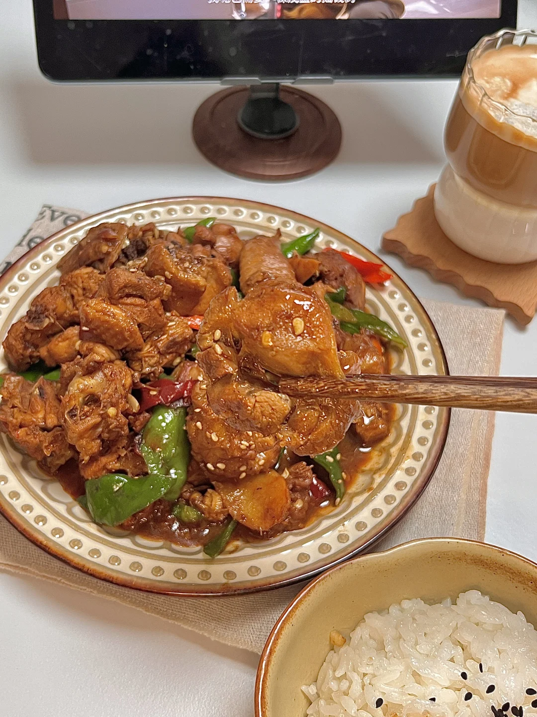 🍴今日份一人食 麻辣小炒鸡 生椰拿铁 . 鸡肉这样做简直太好吃啦,你们一定要试试这个酱汁浓郁的小炒鸡,麻辣鲜香,越吃越上瘾🤤特下饭🍚的一个菜,拌着鸡肉和汤汁巨好吃😋 爱吃的姐妹一定要去试试呀✌🏻