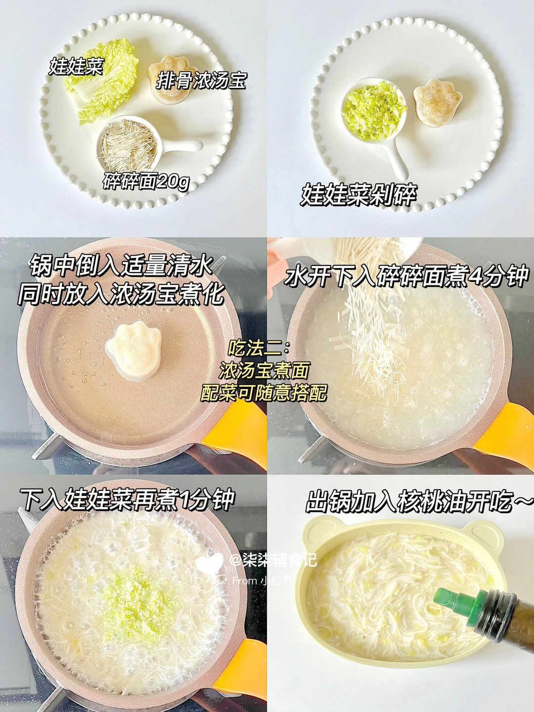▫️锅中烧水,水开放入浓汤宝,再次煮开下入面条,煮熟加入宝宝喜欢吃的青菜即可。