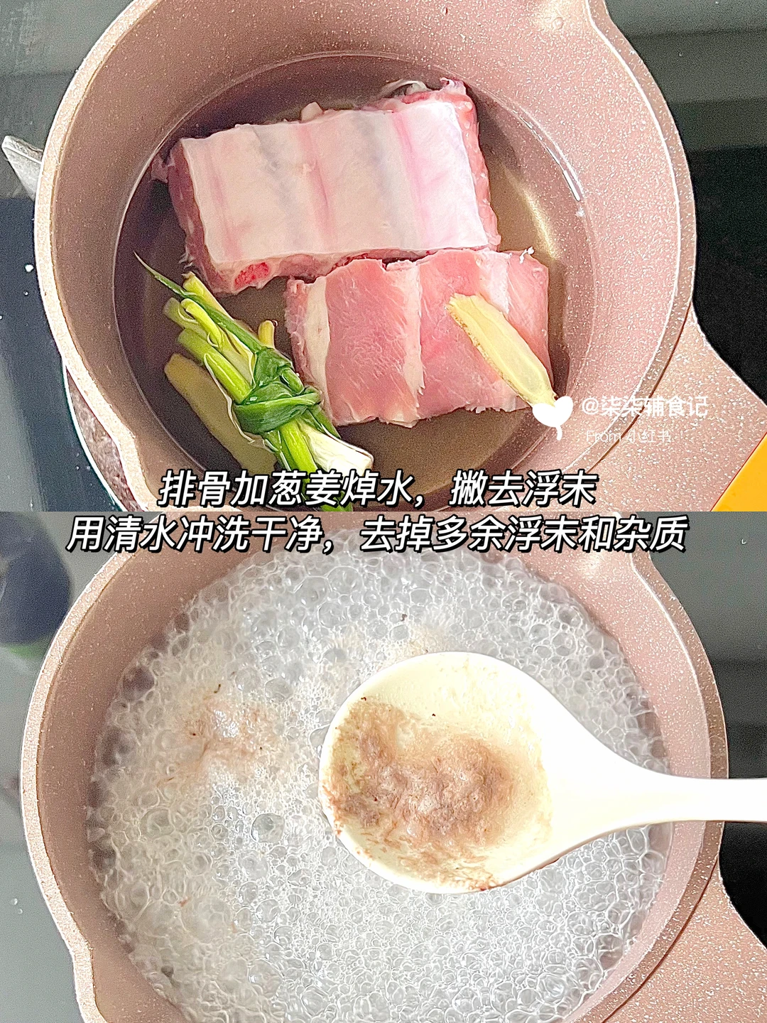 ▫️排骨冷水下锅加姜片焯水去腥,煮开撇去浮末,捞出把多余浮末和其他杂质轻洗干净