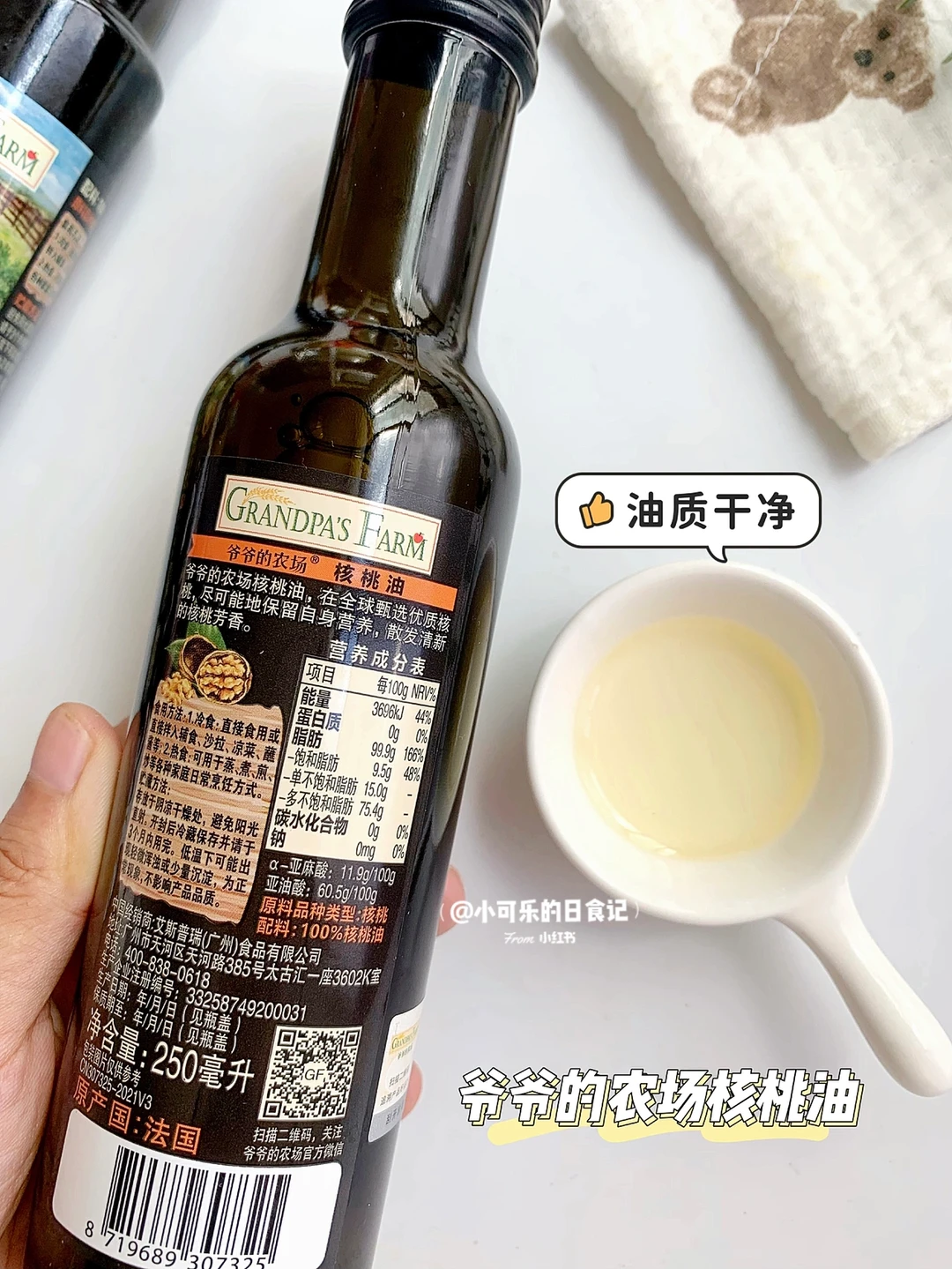 ②配料表:核桃油不能选1oo%脂肪的,一般都是精炼过的,核桃油本身是有少量的矿物质和微量元素,工艺好的油都会保留的