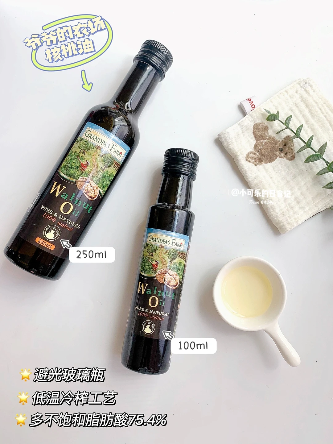 我家宝宝吃的是爷爷的农场核桃油,低温冷榨工艺,多不饱和脂肪酸就能达到75.4%,口感清淡,宝宝容易接受,拌米糊、粥、面条都可以。而且还有大小瓶的包装,小月龄的宝宝可以选100ml的小包装,大月龄的宝宝选大包装更划算~爷爷的农场核桃油是棕色避光玻璃瓶,搭配伸缩油嘴,方便控油不用担心过量的问题了~
