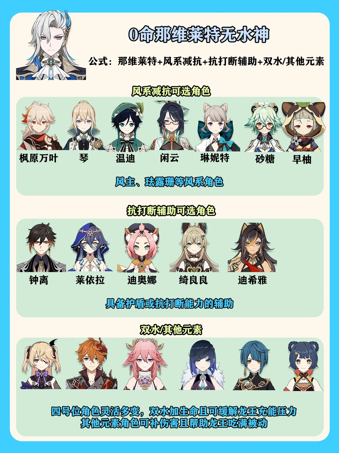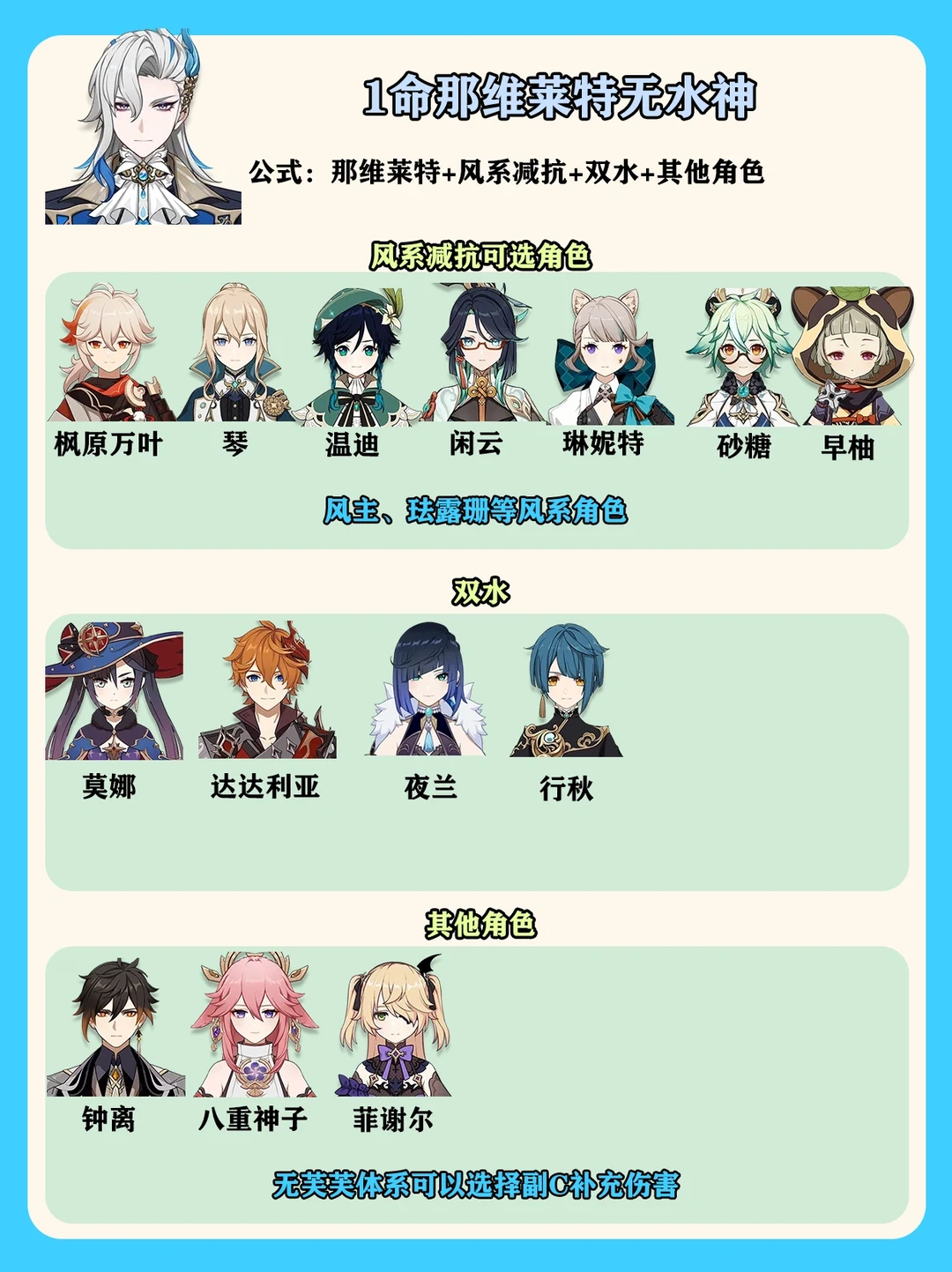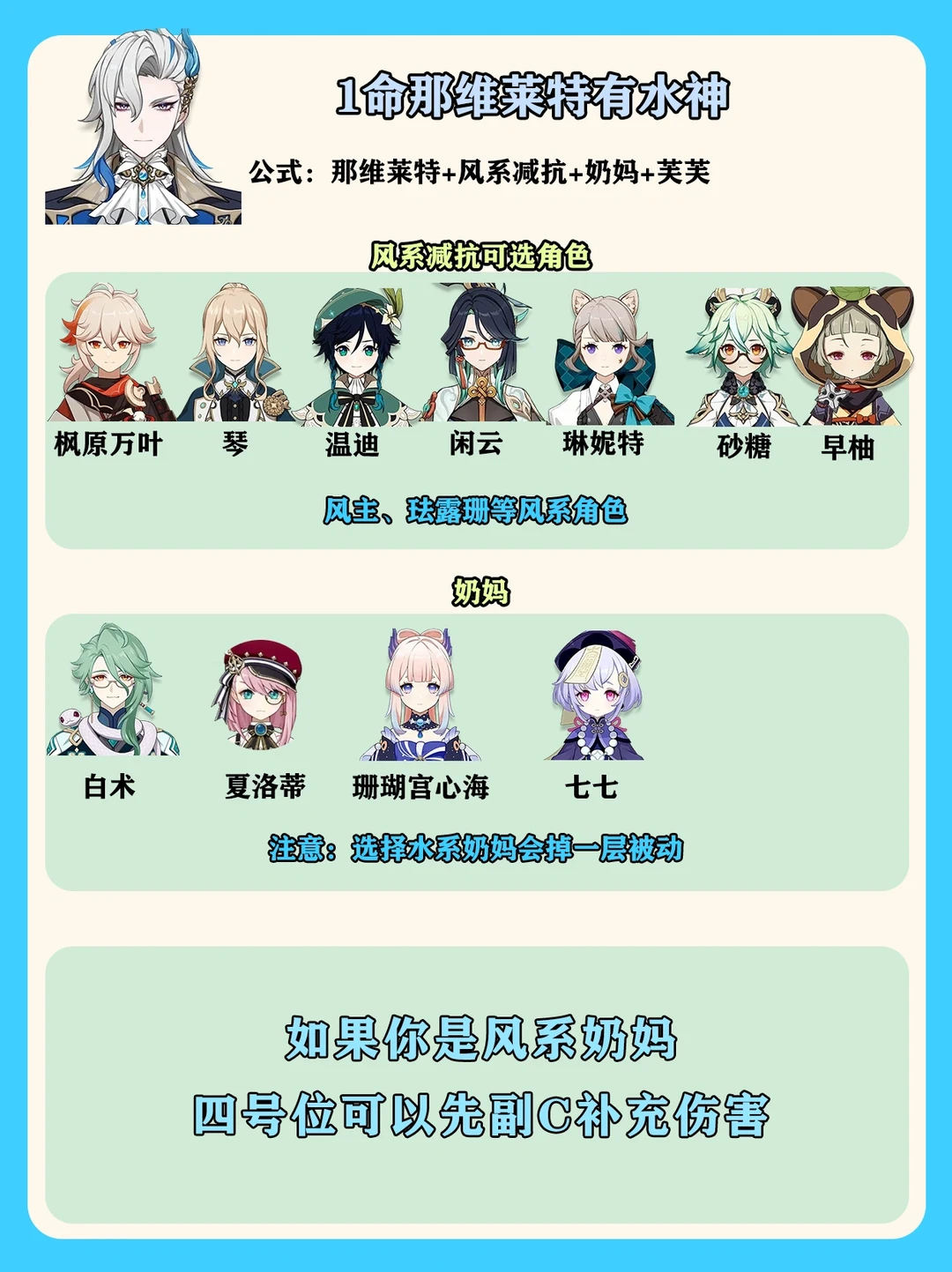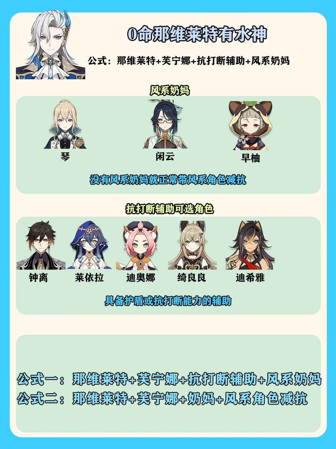 大家好,这里是小橙子猪弟 今天给大家带来的攻略是 那维莱特配队公式 0命那维莱特没有水神的配队公式:那维莱特+风系减抗+抗打断辅助+双水/其他元素 0命那维莱特有水神的配队公式:那维莱特+芙宁娜+抗打断辅助+风系奶妈 1命那维莱特没有水神的配队公式:那维莱特+风系减抗+双水+其他角色 1命那维莱特有水神的配队公式:那维莱特+风系减抗+奶妈+芙芙