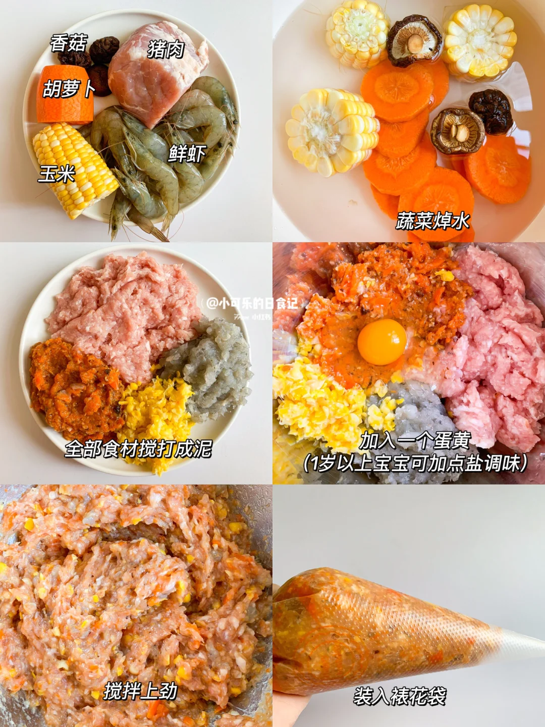 1⃣️蔬菜焯水,虾去壳去虾线,全部食材放入辅食机搅打成泥