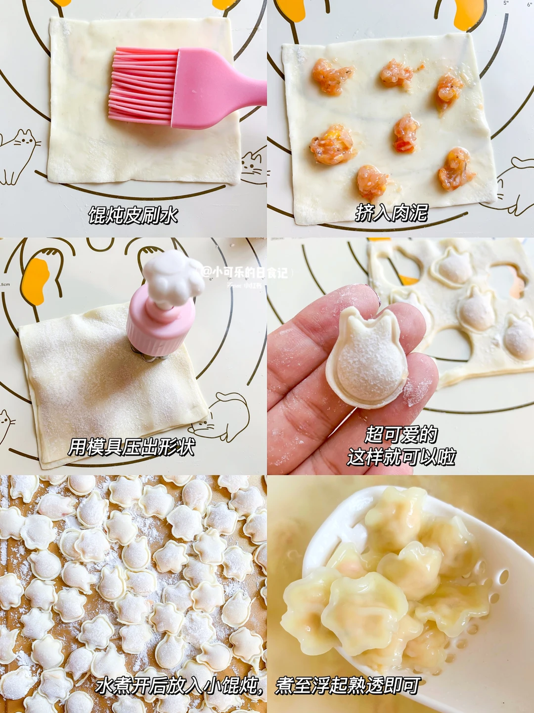 3⃣️馄炖皮刷一层水,挤入肉馅,盖上馄炖皮,用模具压出形状(没有模具也可以用瓶盖)