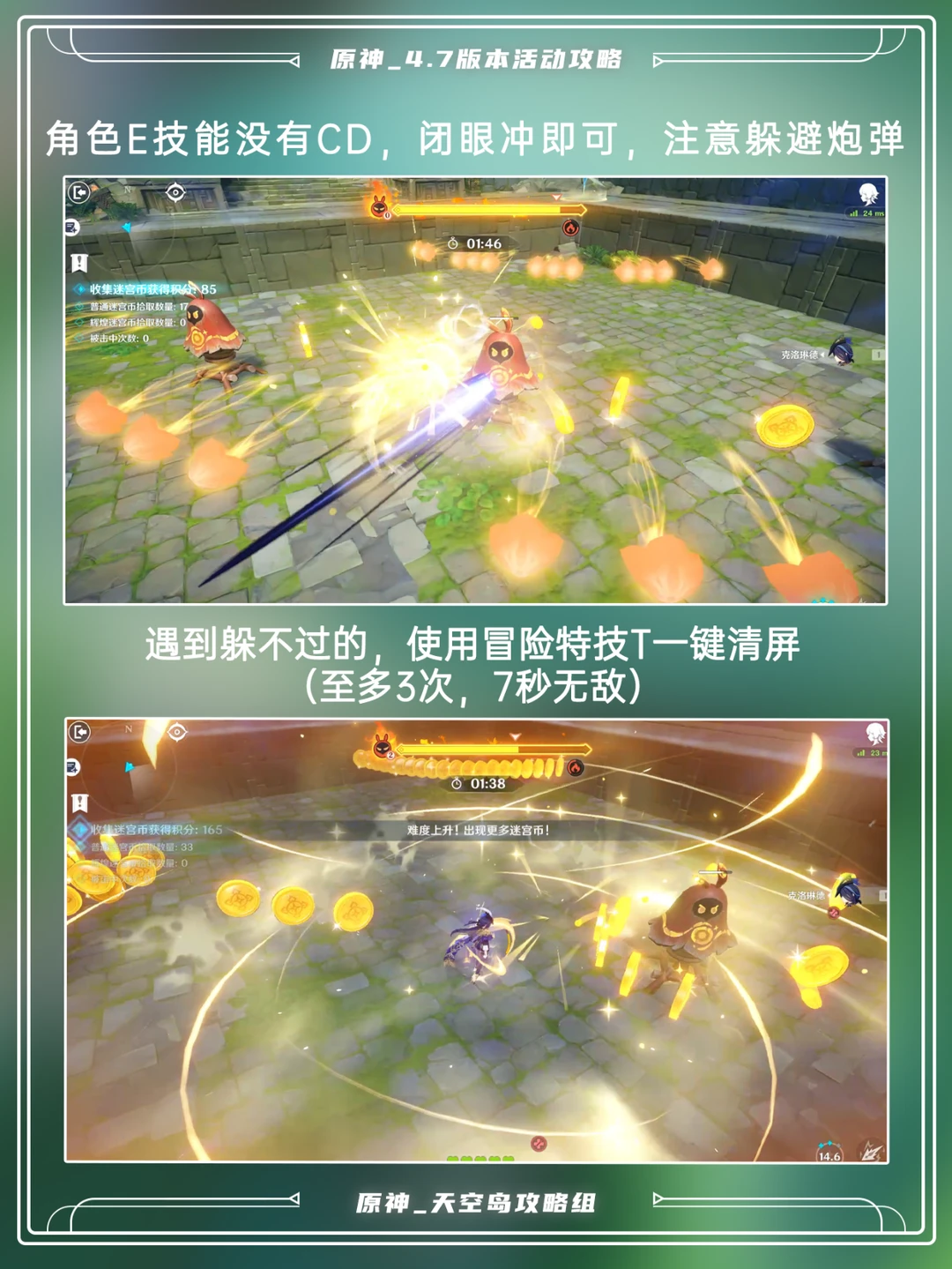 「绎思振笔集」1、2关攻略[哇R] 首日可获得140原石! 核心规则是捡金币打假人,E没有CD,记得使用特技T[飞吻R] 这次活动只开放5天,还能替代每日任务,记得不要拖延,尽快做完