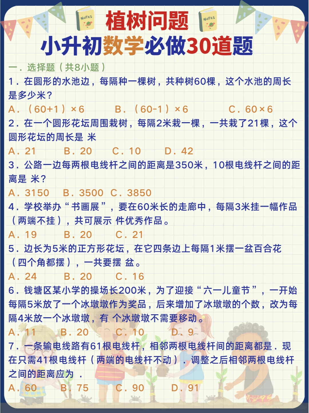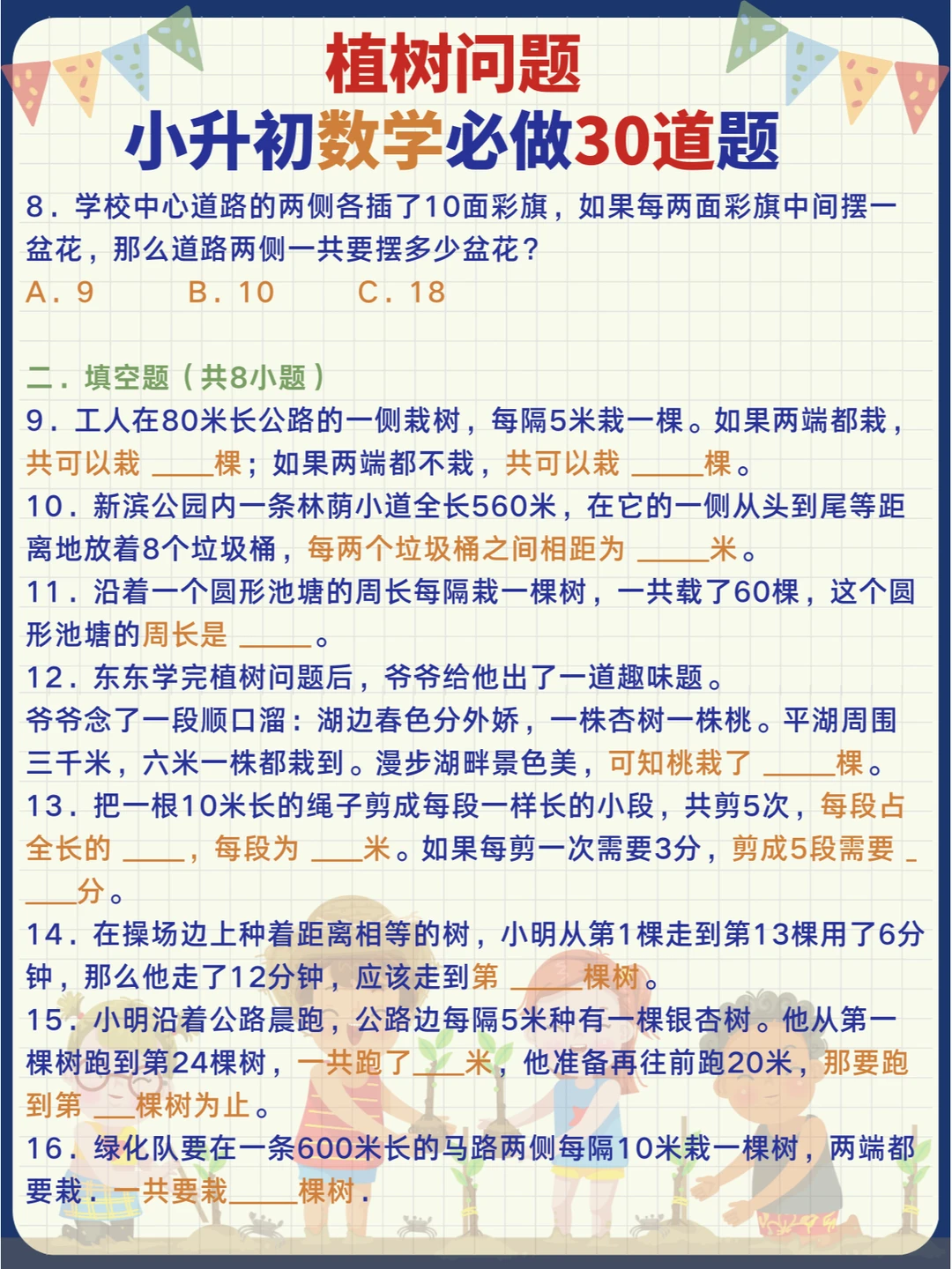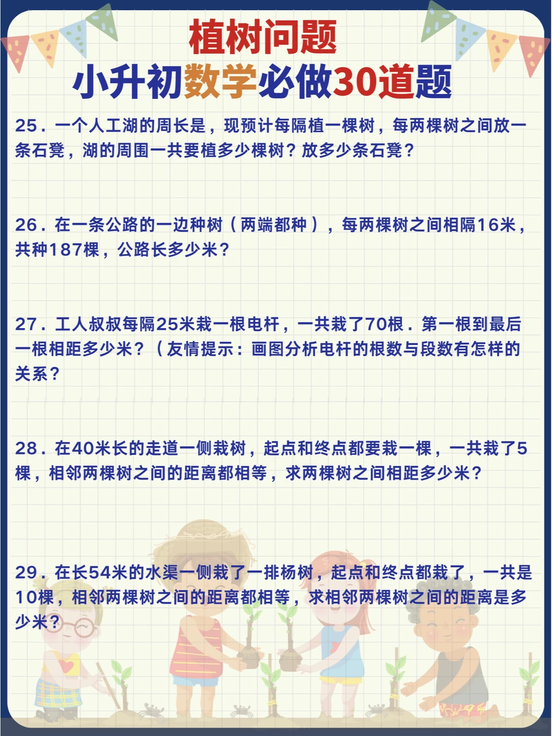 小学数学常考易错奥数题-植树问题🌳,小升初专项提升训练30道题📝 记熟数学公式再做题,事半功倍[哇R] 扩展同类问题来思考,举一反三[派对R]