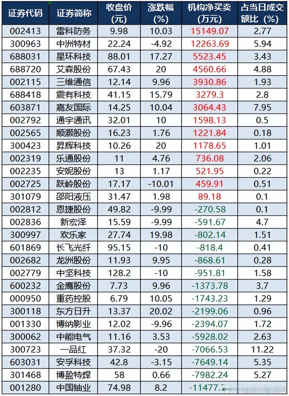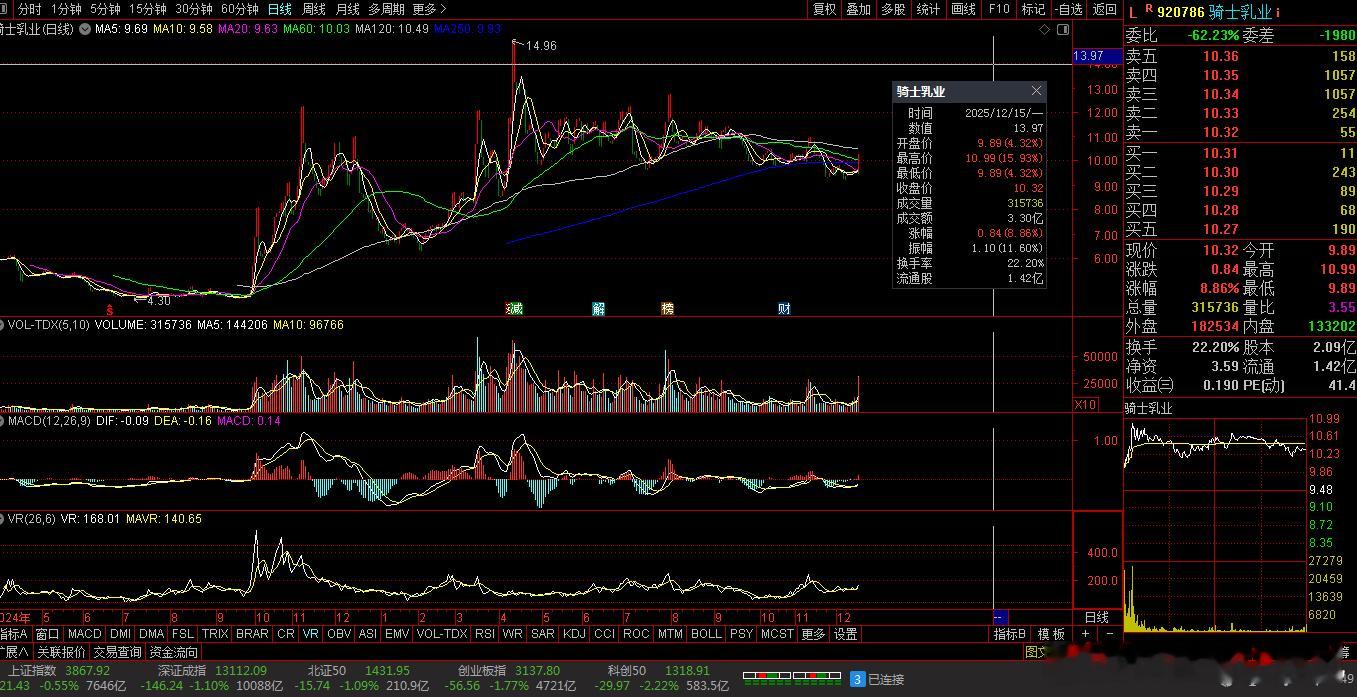 【财富晚茶】今日股市收评:深指跌1.10%:林业震荡回升通讯杀跌导语:作者系《网易号》优质财经领域创作者。曾经原创作者和知名网易号旅游领域创作者。大跨度行业等的写作,颇受网友喜爱。作品发表于2025.12.15.15:18优雅端庄晚风。(全球最佳园林:法国莫奈花园:灵感源自莫奈画作:睡莲池和四季花卉景观闻名)一、视野焦点:恰似“火眼金睛”920786 骑士乳业 盘中-01涨1、突破三年箱顶视野盘面:前期三顶:震荡突破。2025-12-15 截至15:00:股价报收:10.32元。该股上涨:8.86%。成交总量:315736手,成交金额:3.30亿元。总换手率2.20%,观总市值:19.82亿元。流通市值:13.48亿元。2、牧草奶牛翘楚主营业务:牧草种植-牛场运营-奶牛集约化养殖-优质生鲜乳供应的研产和销售。公司品牌:全产业链乳制品综合供应商和头部企业。3、经营优良企业财报透视:2025-09-30 三季度报:公司营收:9.1353亿 同比增24.01%。公司净利:3909.7136万 同比增281.30%。二、空方强势:恰似“弱肉强食”1、博弈追踪盘面第一、沪深盘面透析沪深回放:跌宕起伏。早盘:低开五涨,三跌三涨。午盘:三跌二涨,三跌一涨。尾盘:三跌一涨,次低绿盘。第二、透析沪深指数追寻沪深:跌宕起伏沪指跌0.55%(021.43点),报03867.92点,成交额07646亿。深指跌1.10%(146.24点),报13112.09点,成交额10088亿。创指跌1.77%(056.56点),报03137.80点,成交额04721亿。北指跌1.09%(015.74点),报01431.95点,成交额00210亿。沪深北市:合计成交:17945亿元。2、复盘沪深个股第一、今日个股视野今日观察:涨跌互动。2315股上涨,73个股涨停板。2966股下跌,15跌停板。沪深北市:合计成交17945亿元。三、沪阳深阴:恰似“阴盛阳衰”1、洞察机构尾盘主旋律:沪深强势,尾盘拉抬。沪指距9:31-15:00:前1小时放量盘升,中2小时略量盘跌,后1小时略量盘跌。深指距9:31-15:00:前1小时放量盘升,中2小时略量盘跌,后1小时略量盘跌。沪深两市:合计成交:17945亿元。四、资金流向:恰似“水落石出”1、目击主力资金Wind统计显示:主力资金全天净流出360.27亿元;其中,创业板主力资金净流出155.99亿元;沪深300成份股主力资金净流出136.37亿元;科创板主力资金净流出1.68亿元。所属的31个一级行业,今日有9个行业主力资金呈现净流入,其中,国防军工行业主力资金净流入最多,净流入金额为15.73亿元;行业主力资金净流入居前:商贸零售、食品饮料、房地产等。22个行业主力资金呈现净流出,其中,电子行业主力资金净流出最多,净流出金额为102.58亿元;行业主力资金净流出靠前:有色金属、电力设备、通信、机械设备、计算机。2、龙虎榜晴雨表收盘龙虎榜数据:机构席位资金合计:净买入约1460.15万元。其中,净买入的个股14只,净卖出的个股15只。机构净买入最多:是雷科防务,净买入金额约1.51亿元;机构净买入居前:中洲特材、星环科技、艾森股份等股。机构净卖出最多:中国铀业,净卖出金额约1.15亿元;机构净卖出居前的还有博盈特焊、安孚科技、一品红等股。3、涨停板跌停板第一、板块涨停上涨板块:林业、商誉减值、航天装备、特钢、保险等。下跌板块:其他电子、消费电子、医疗美容、元器件、高贝塔值等。第二、个股涨跌沪深个股:跌多涨少,空方强势,略胜一筹。其中,2315股上涨,73个股涨停板。2966股下跌,15跌停板。沪深北市:合计成交17945亿元。4、明天趋势先知第一、沪指预测12月16日:沪指突破阻力:03896点看涨,前程似锦;跌破支撑位:03863点看跌,日暮途穷。第二、深指预测12月16日:深指突破阻力:13244点看涨,鹏程万里;跌破支撑位:13111点看跌,不堪造就。五、本创作者:恰似“优质网易”投资投机迷茫之中:给予尽可能有帮助:资本市场风险自负。(优雅端庄晚风《网易号》优质财经领域创作者和原创作者; 违者必究)