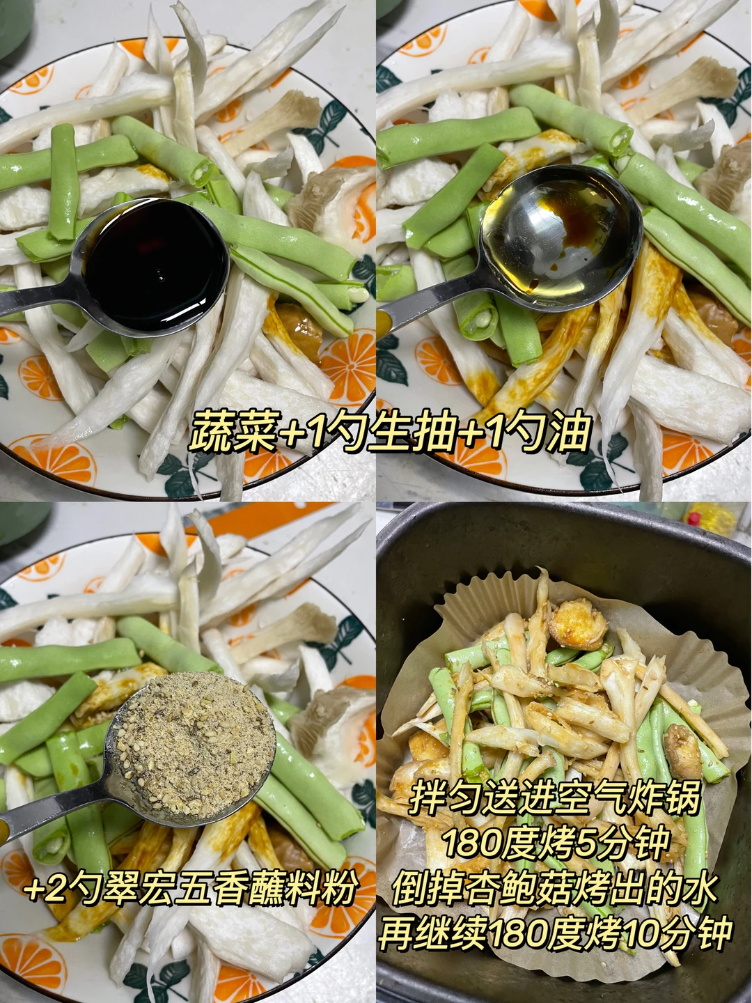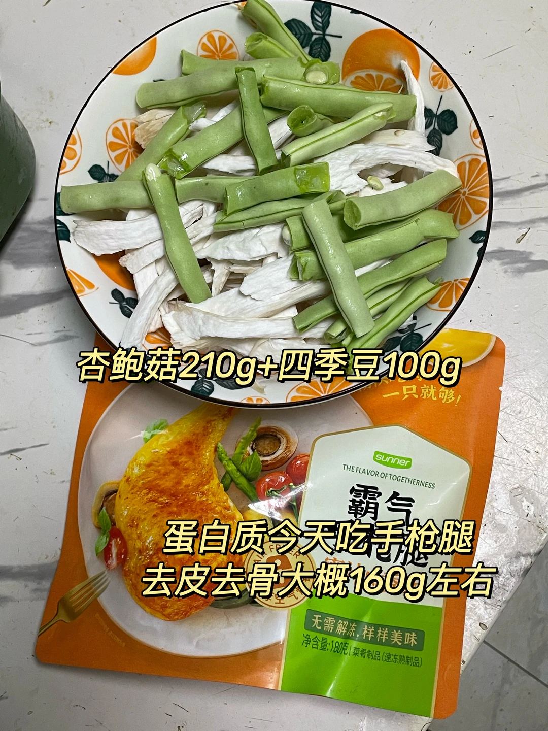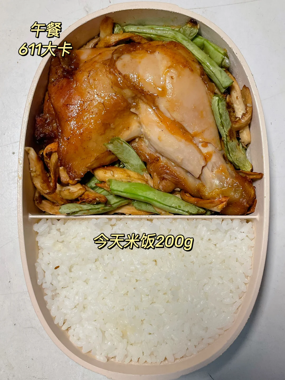 午 米饭+烤鸡腿+烤四季豆杏鲍菇