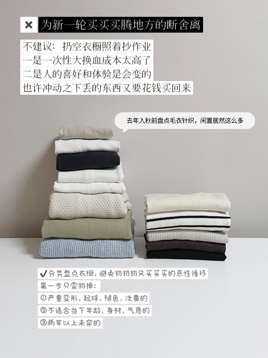 ✔分类盘点衣橱,避免扔扔扔又买买买的恶性循环。第一步只需扔掉: