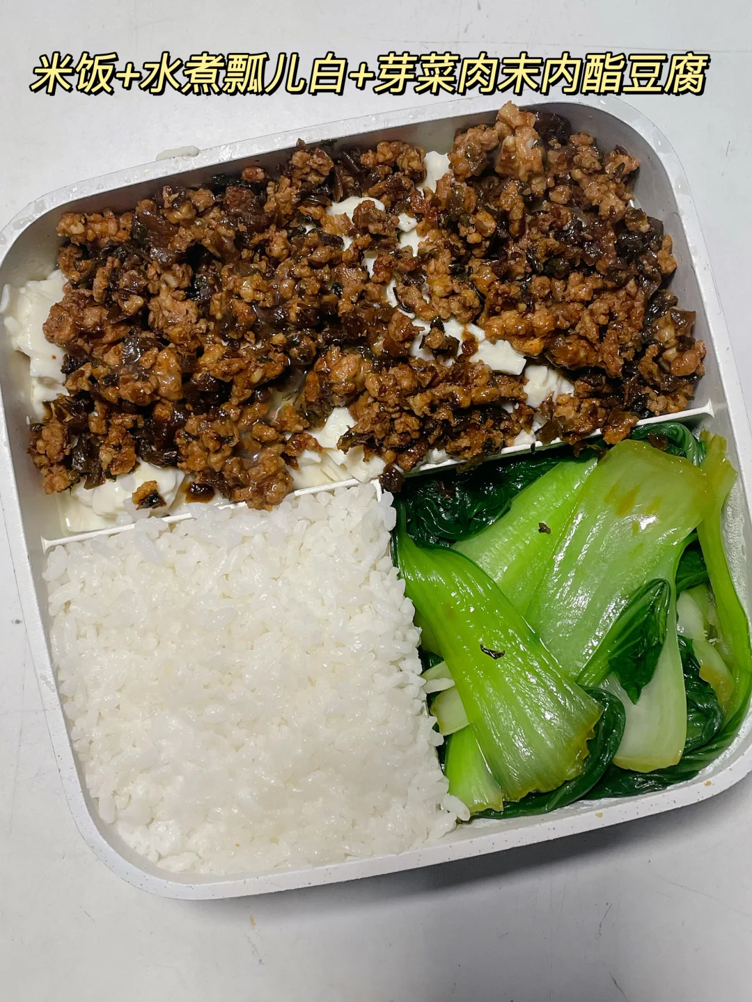 📍米饭+青椒肉丝+小白菜 📍米饭+芽菜肉末内酯豆腐+瓢儿白 📍米饭+奥尔良烤排骨+菜心 📍米饭+肉沫炒豆角+小白菜 📍米饭+卤鸡腿+蒜香黄豆芽