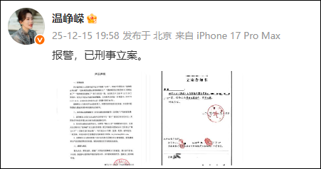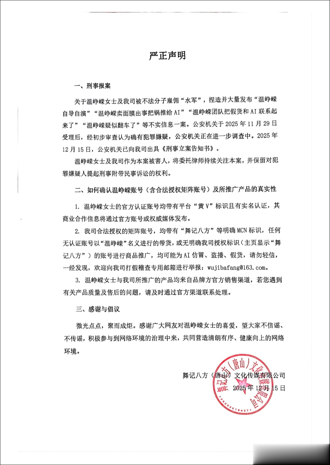 声明中称:关于温峥嵘女士及我司被不法分子雇佣“水军”,捏造并大量发布“温峥嵘自导自演”“温峥嵘卖面膜出事把锅推给AI”“温峥嵘团队把假货和AI联系起来了”“温峥嵘疑似翻车了”等不实信息一案。公安机关于2025年11月29日受理后,经初步审查认为确有犯罪嫌疑,公安机关正在进一步调查中。2025年12月15日,公安机关已向我司出具《刑事立案告知书》。