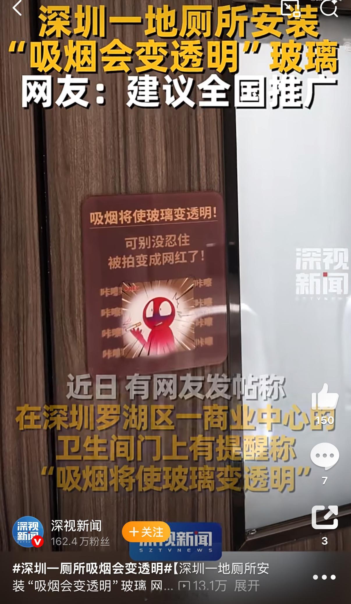 深圳一地厕所吸烟会变透明深圳太超前了!不愧是国际大都市👍希望卷烟和电子烟都能一