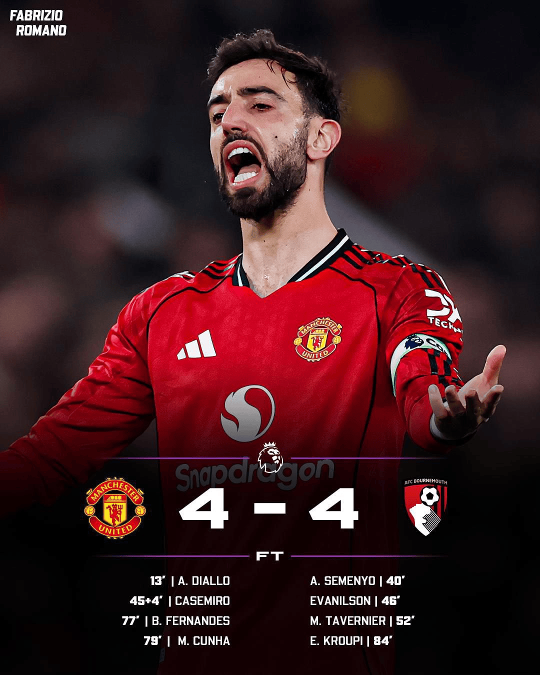 虎扑12月16日讯英超第16轮,曼联在下半场一度2-3落后的情况下最终4-4战平伯恩茅斯。