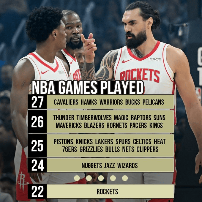 火箭队本赛季仅打了22场比赛,已有五支球队打了多达27场比赛。