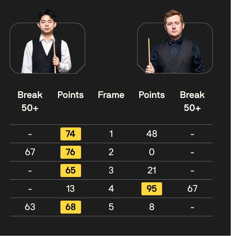开场后袁思俊连胜三局并在第二局中打出单杆67分,第四局沃拉斯顿打出单杆67分扳回一城,第五局袁思俊打出单杆63分锁定胜局。