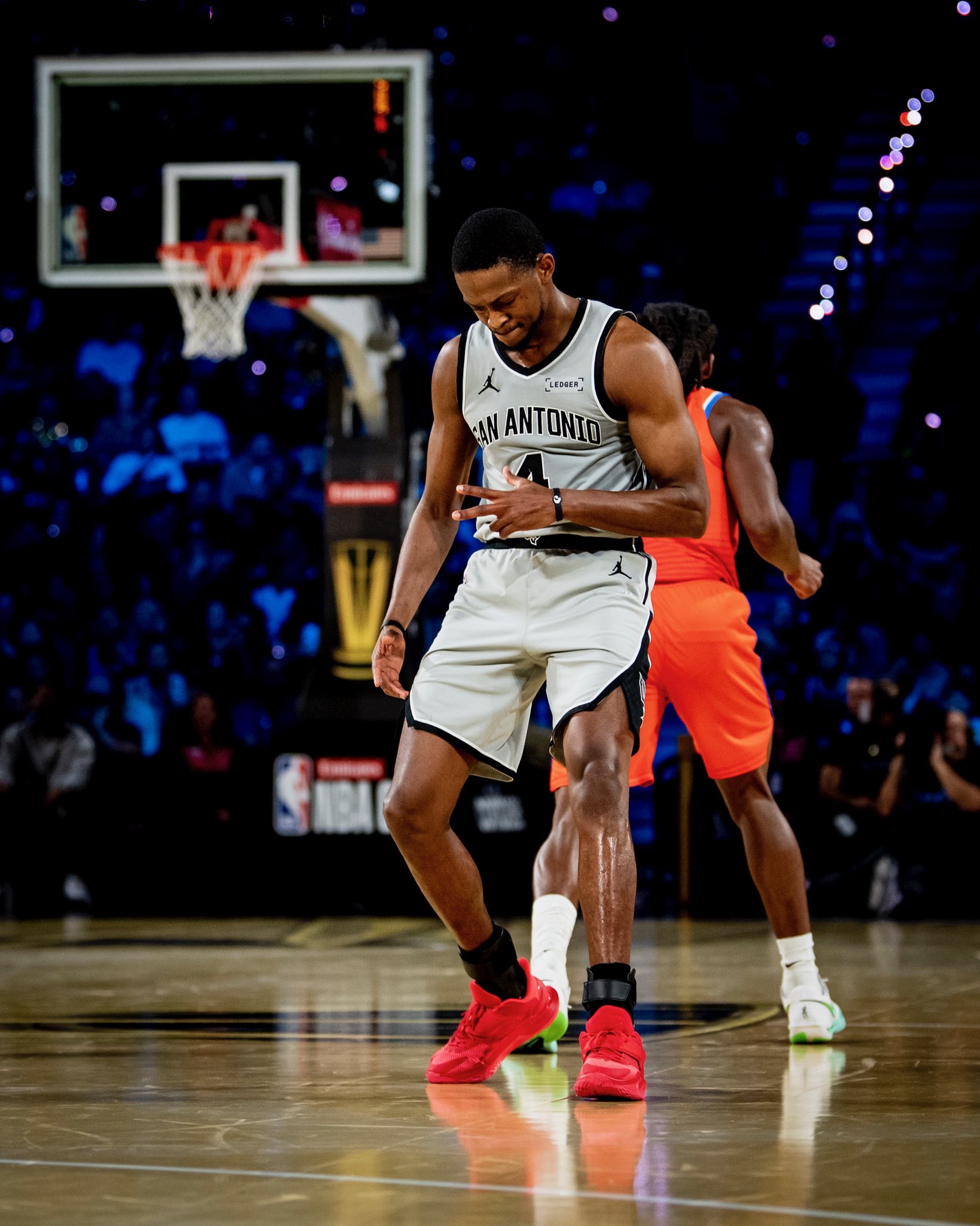 虎扑12月16日讯今日,马刺球员达龙-福克斯更新社媒晒出NBA杯半决赛的个人赛场特写照片,并配文: